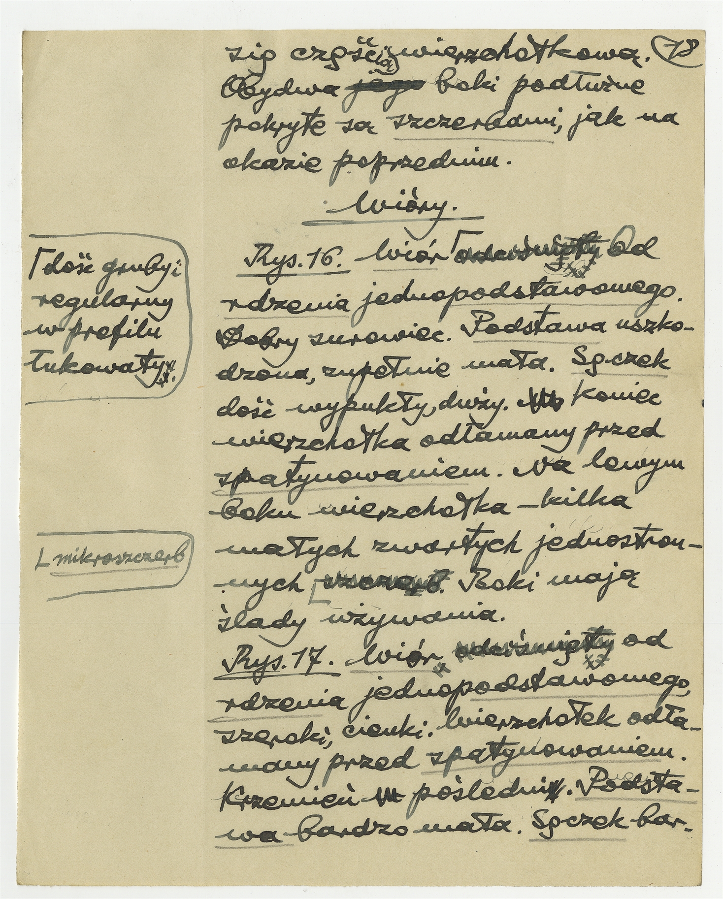 Rękopis części pracy zatytułowanej "II. Część prahistoryczna" wchodzącej w skład opracowania S. Krukowskiego oraz J. Polańkiego pt. "Pierwsze stanowisko paleolityczne w Nowosiółce Kostiukowej (Podole)" - strona 20: "Narzędzia z odłupkiem" c.d. "Wióry"