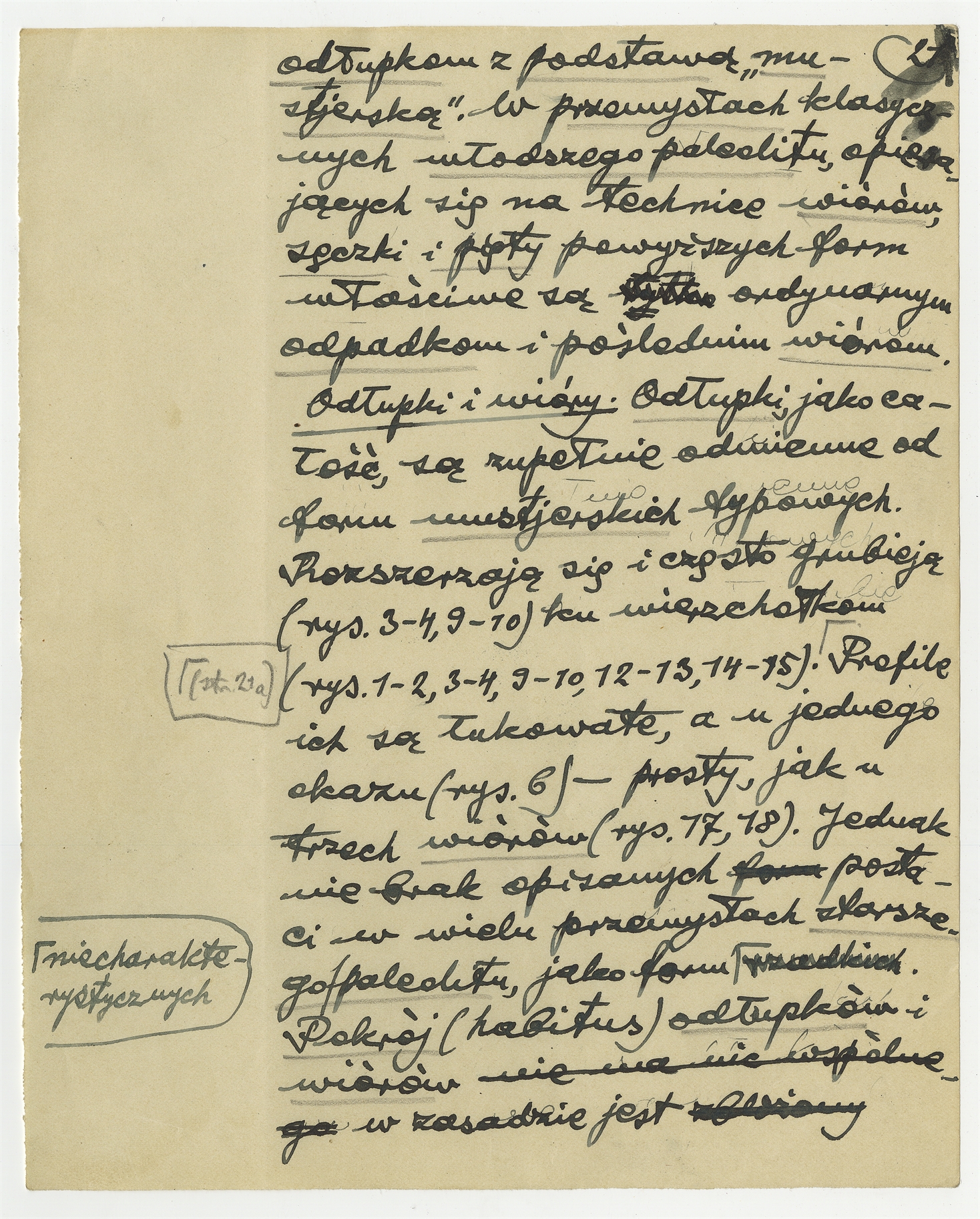 Rękopis części pracy zatytułowanej "II. Część prahistoryczna" wchodzącej w skład opracowania S. Krukowskiego oraz J. Polańkiego pt. "Pierwsze stanowisko paleolityczne w Nowosiółce Kostiukowej (Podole)" - strona 24: "Ogólne właściwości morfologiczne wyrobów pod względem porównawczym" c.d.