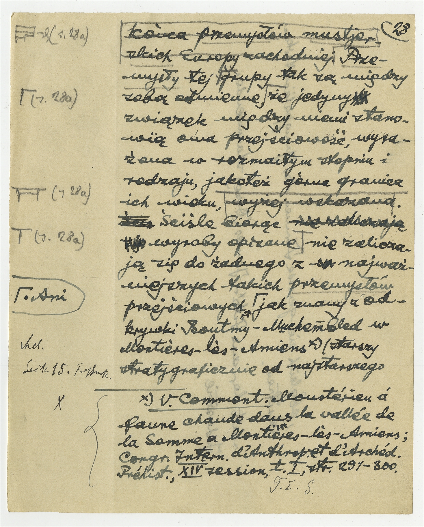 Rękopis części pracy zatytułowanej "II. Część prahistoryczna" wchodzącej w skład opracowania S. Krukowskiego oraz J. Polańkiego pt. "Pierwsze stanowisko paleolityczne w Nowosiółce Kostiukowej (Podole)" - strona 31: "Próba charakterystyki przemysłu" c.d.