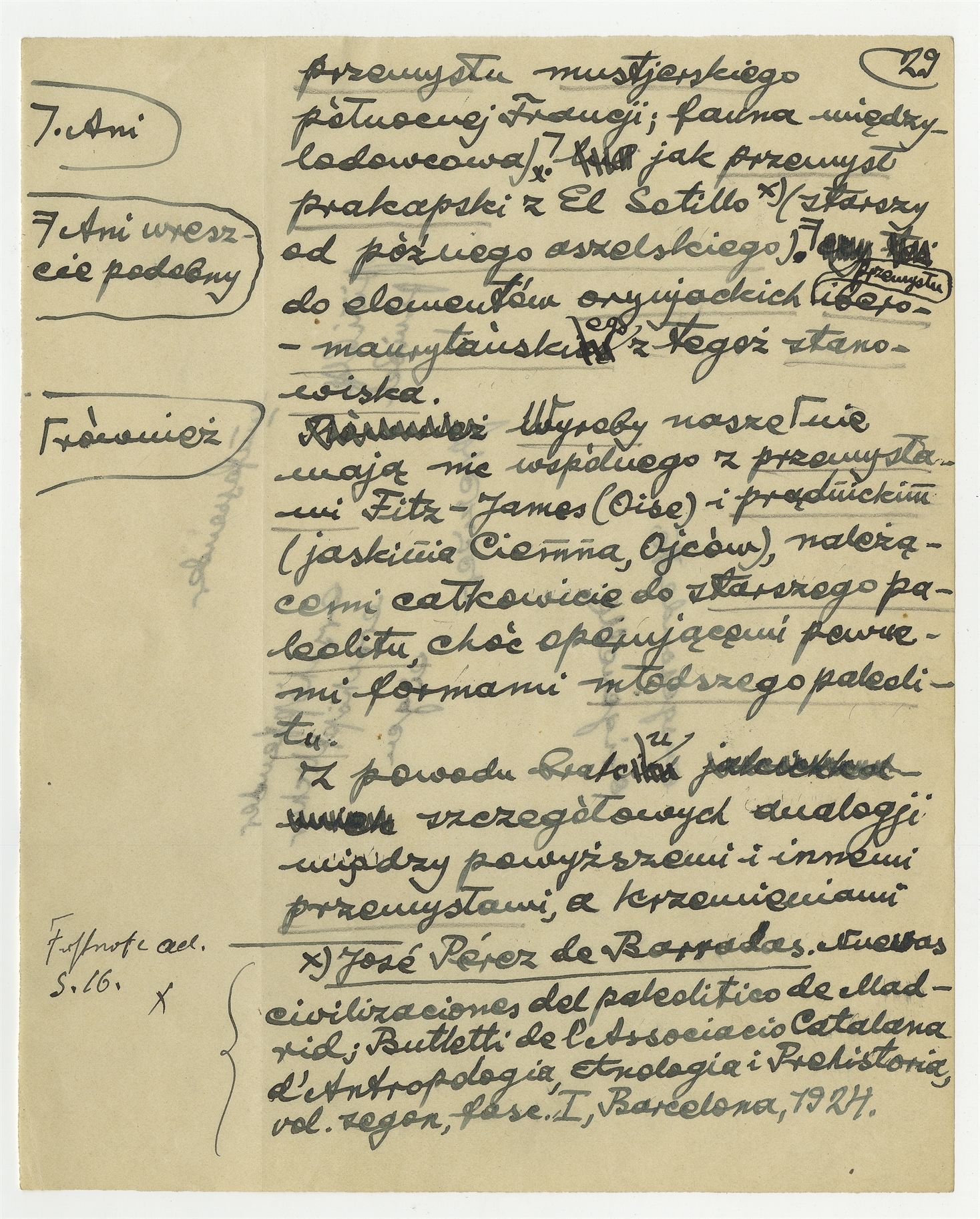Rękopis części pracy zatytułowanej "II. Część prahistoryczna" wchodzącej w skład opracowania S. Krukowskiego oraz J. Polańkiego pt. "Pierwsze stanowisko paleolityczne w Nowosiółce Kostiukowej (Podole)" - strona 33: "Próba charakterystyki przemysłu" c.d.
