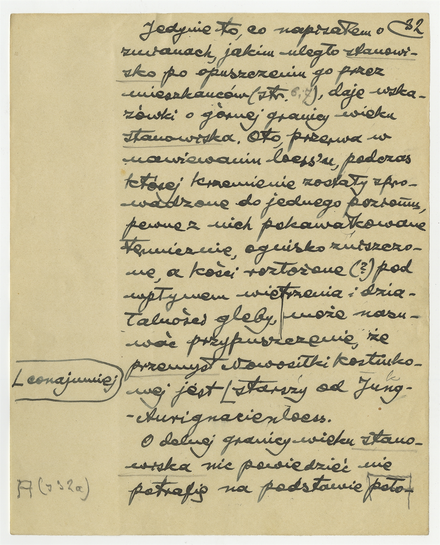Rękopis części pracy zatytułowanej "II. Część prahistoryczna" wchodzącej w skład opracowania S. Krukowskiego oraz J. Polańkiego pt. "Pierwsze stanowisko paleolityczne w Nowosiółce Kostiukowej (Podole)" - strona 38: "Sytuacja chronologiczna" c.d.