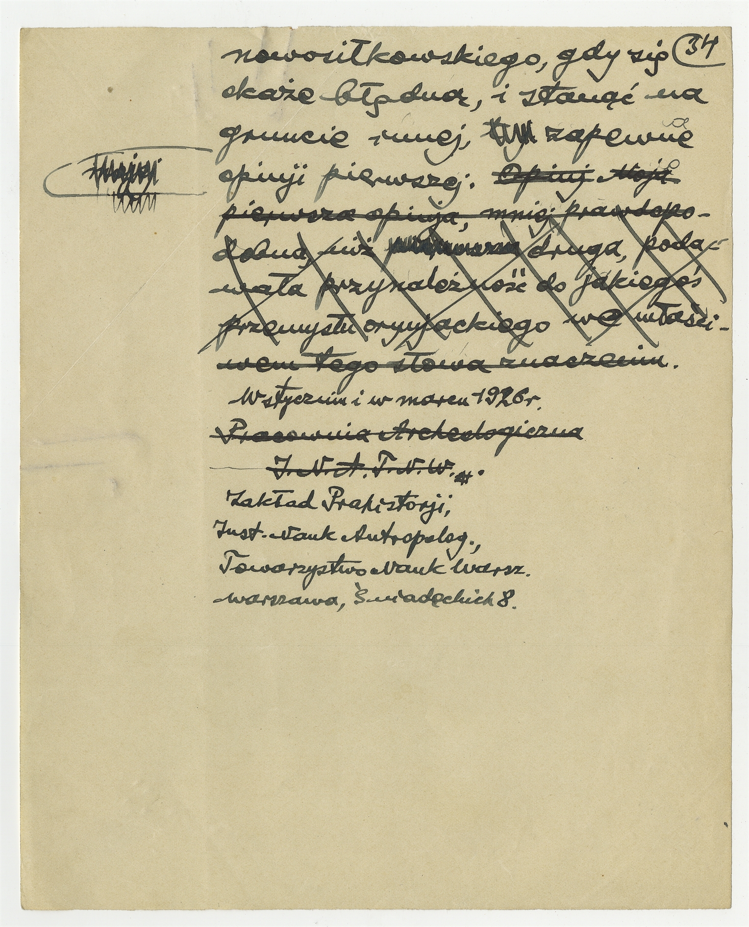 Rękopis części pracy zatytułowanej "II. Część prahistoryczna" wchodzącej w skład opracowania S. Krukowskiego oraz J. Polańkiego pt. "Pierwsze stanowisko paleolityczne w Nowosiółce Kostiukowej (Podole)" - strona 40: zakończenie; w styczniu i marcu 1926 r.