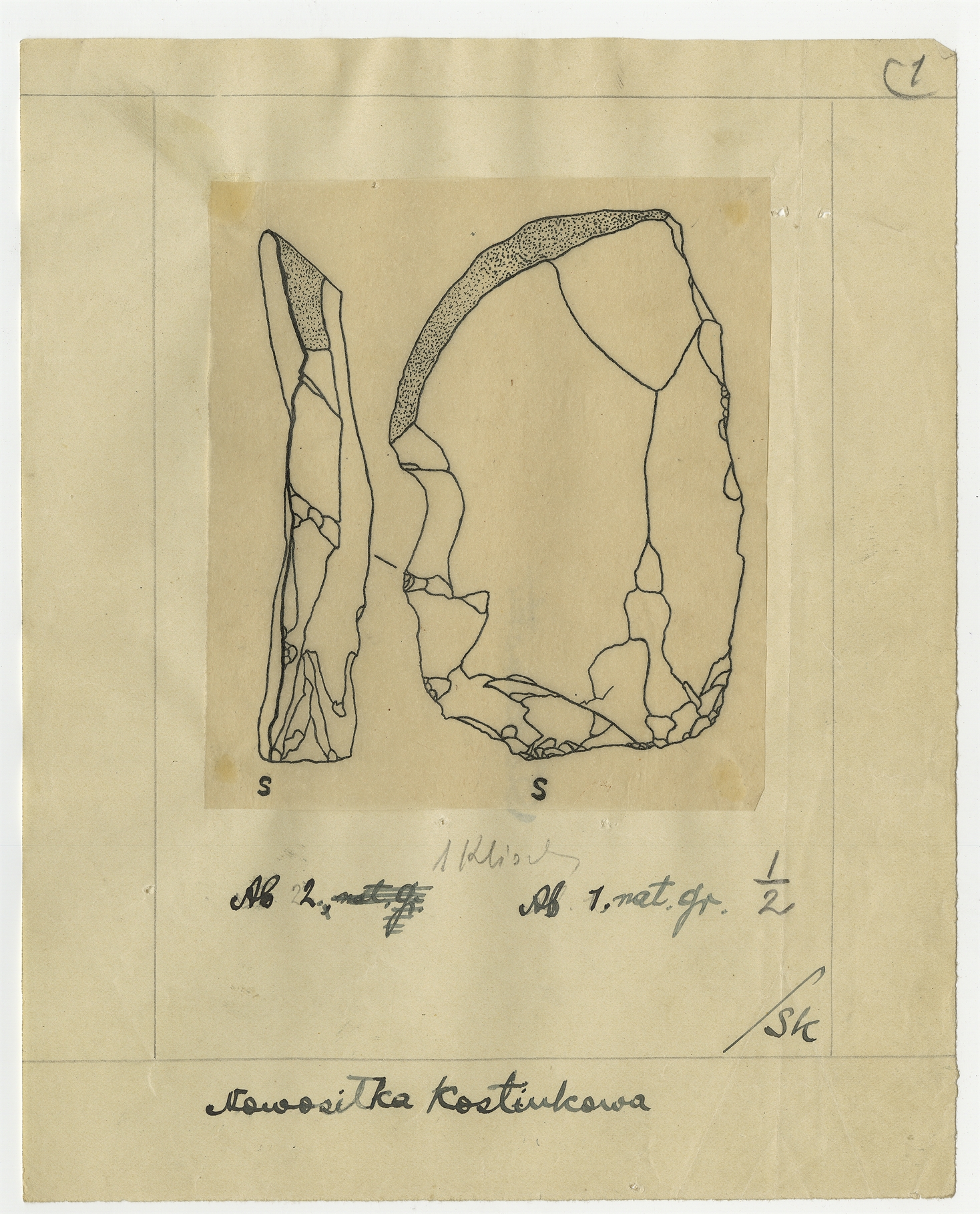 Rękopis części pracy zatytułowanej "II. Część prahistoryczna" wchodzącej w skład opracowania S. Krukowskiego oraz J. Polańkiego pt. "Pierwsze stanowisko paleolityczne w Nowosiółce Kostiukowej (Podole)" - strona 41: tablica zawierająca ilustracje 1 2