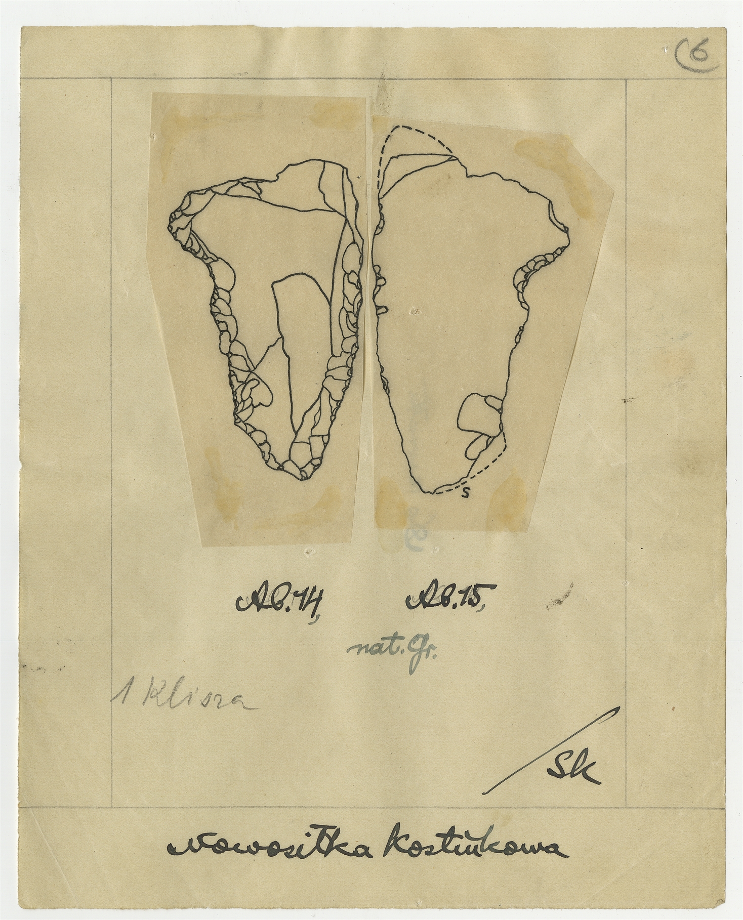 Rękopis części pracy zatytułowanej "II. Część prahistoryczna" wchodzącej w skład opracowania S. Krukowskiego oraz J. Polańkiego pt. "Pierwsze stanowisko paleolityczne w Nowosiółce Kostiukowej (Podole)" - strona 51: tablica zawierająca ilustracje 14 15