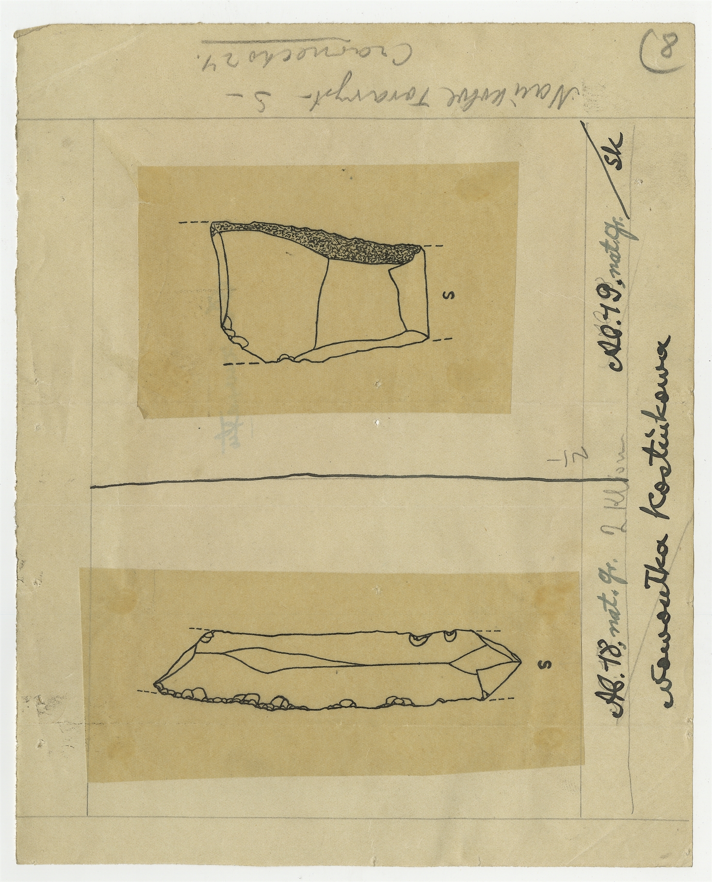 Rękopis części pracy zatytułowanej "II. Część prahistoryczna" wchodzącej w skład opracowania S. Krukowskiego oraz J. Polańkiego pt. "Pierwsze stanowisko paleolityczne w Nowosiółce Kostiukowej (Podole)" - strona 55: tablica zawierająca ilustracje 18 19