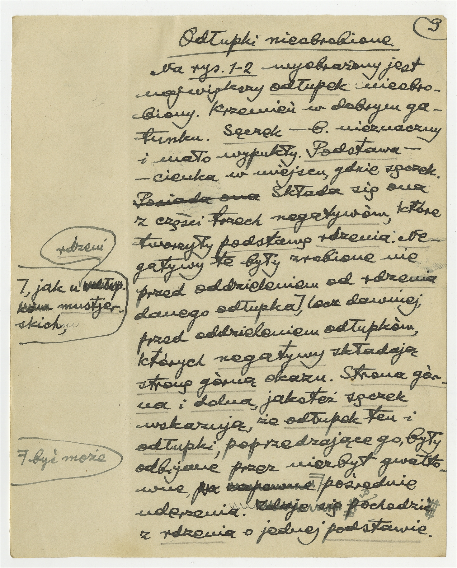 Rękopis części pracy zatytułowanej "II. Część prahistoryczna" wchodzącej w skład opracowania S. Krukowskiego oraz J. Polańkiego pt. "Pierwsze stanowisko paleolityczne w Nowosiółce Kostiukowej (Podole)" - strona 9: "Odłupki nieobrabiane"