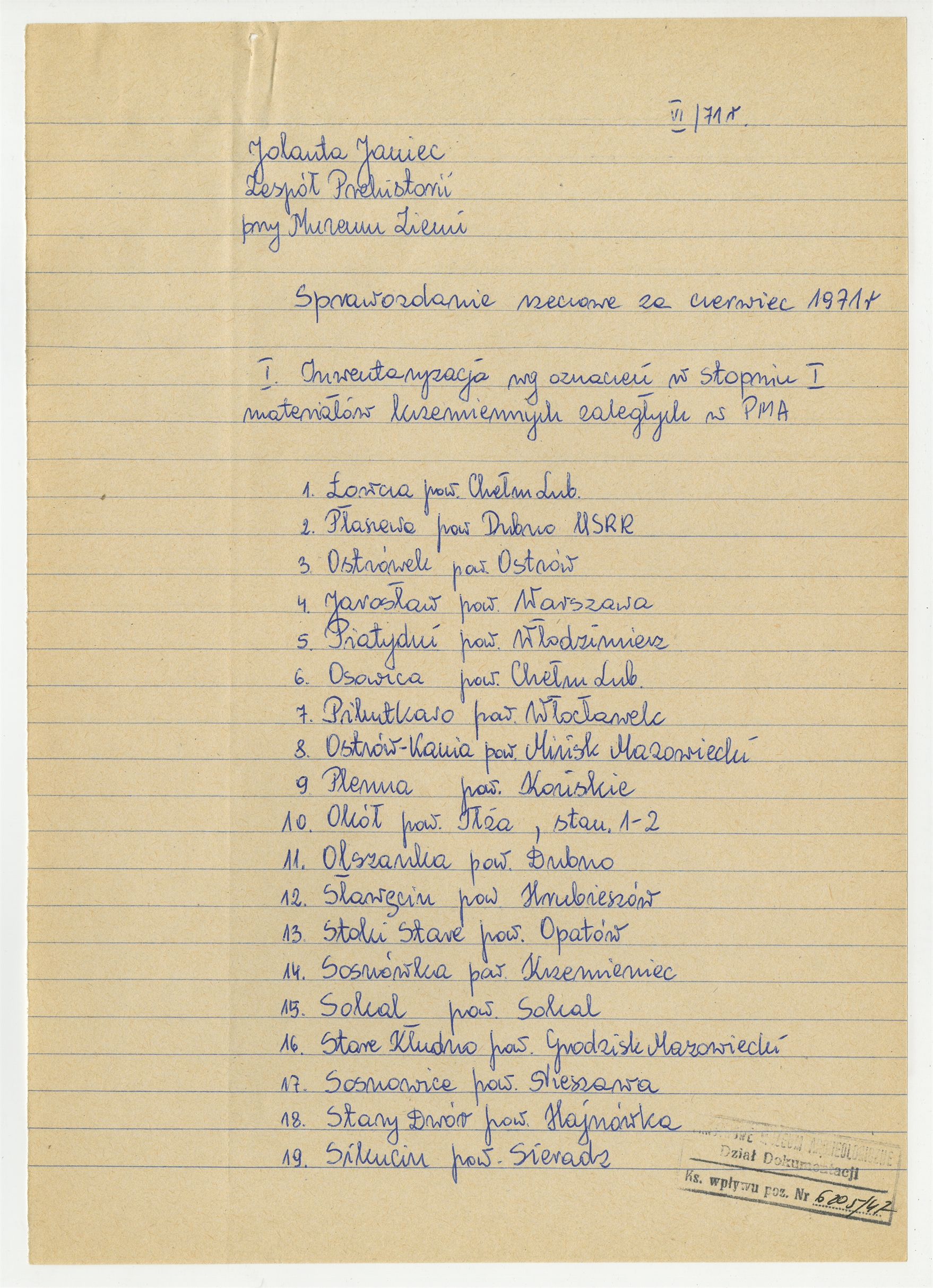 Rękopis dokumentu pt. "Sprawozdanie rzeczowe za czerwiec 1971 r." sporządzony przez Jolantę Janiec członka Zespołu Prehistorii przy Muzeum Ziemi PAN VI [19]71 r. - strona 1: "I. Inwentaryzacja wg oznaczeń w stopniu I (…)"