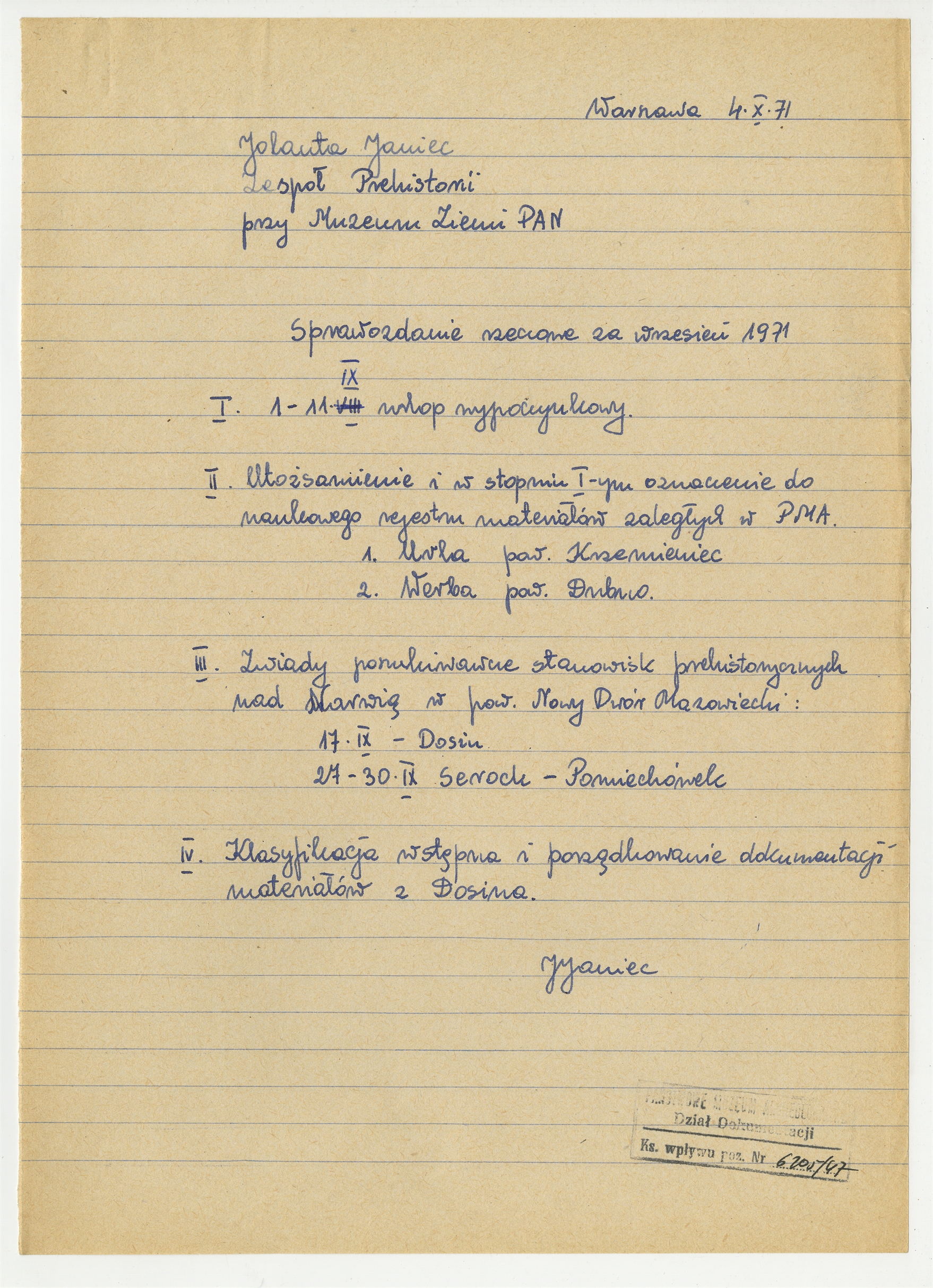 Rękopis dokumentu pt. "Sprawozdanie rzeczowe za wrzesień 1971" sporządzony przez Jolantę Janiec członka Zespołu Prehistorii przy Muzeum Ziemi PAN Warszawa 4 X [19]71 r. - strona 1