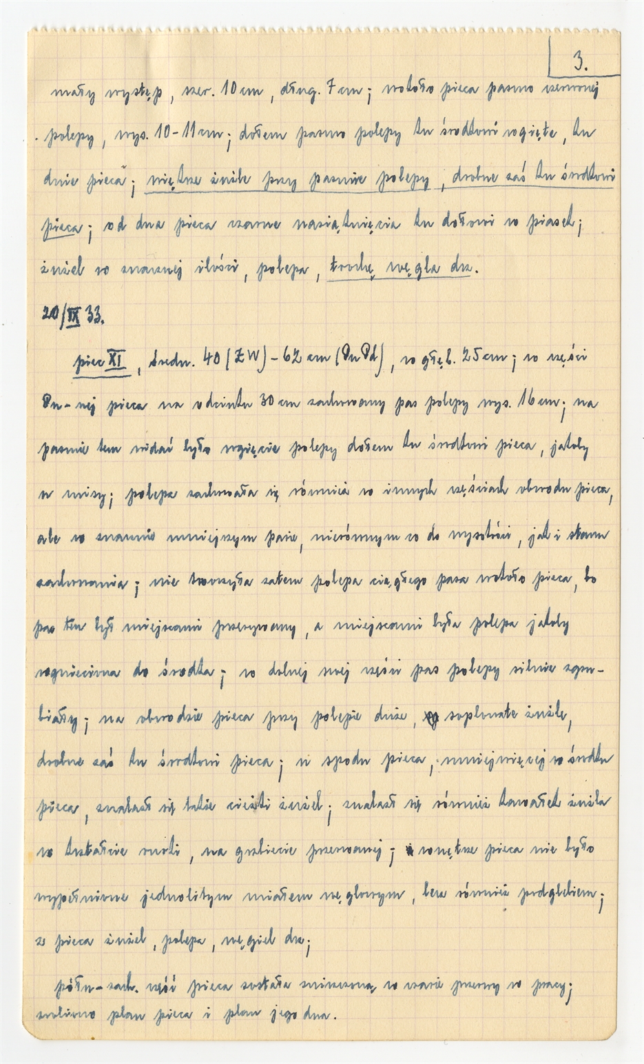 Rękopis - dziennik badań (czystopis) ze stanowiska Skowroniec (Małe Podgaje hucisko na polu gosp. Piotra Gąsiora "Przed Gienią") 16-21 IX [19]33 roku. Opisy obiektów. Strona 3