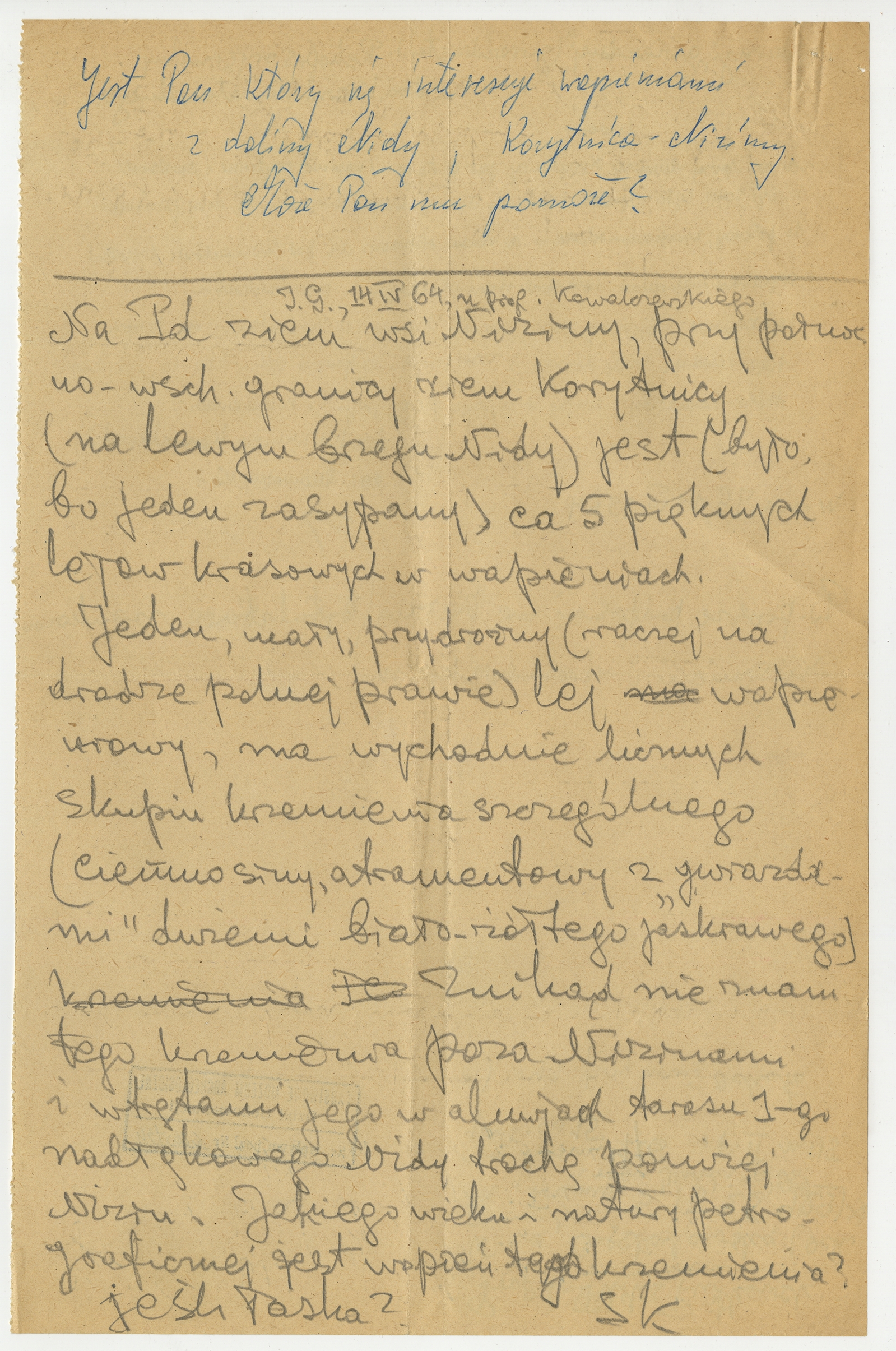 Rękopis – informacja na temat wapieni w dolinie Nidy. 14 kwietnia 1964 r. str. 1: „Jest Pan który interesuje się wapieniami z doliny Nidy(...)”