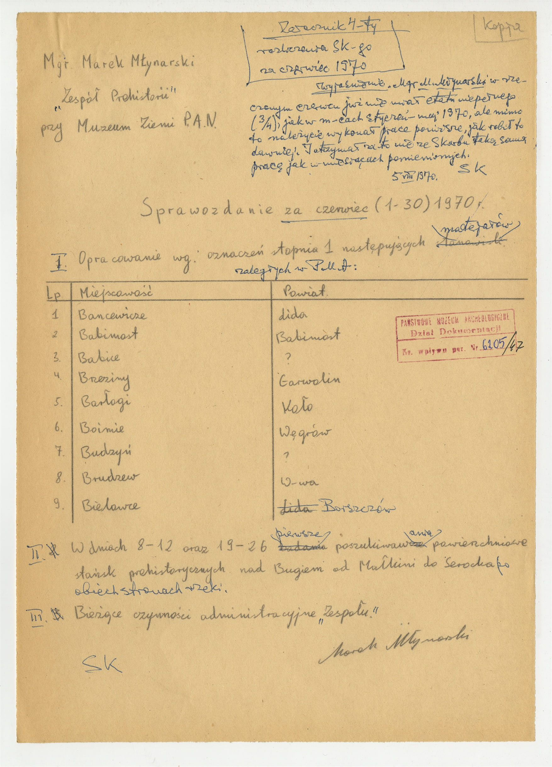 Rękopis - kopia dokumentu pt. "Sprawozdanie za czerwiec (1-30) 1970 r." sporządzony przez Marka Młynarskiego członka Zespołu Prehistorii przy Muzeum Ziemi PAN wraz z adnotacją S. Krukowskiego z dnia 5 VIII 1970 r. - strona 1