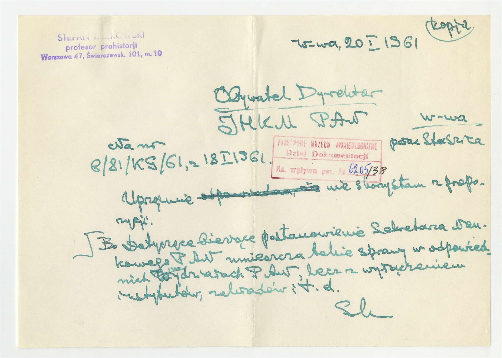 Rękopis - kopia listu Stefana Krukowskiego do Dyrektora IHKM PAN z dnia 20 I 1961 roku