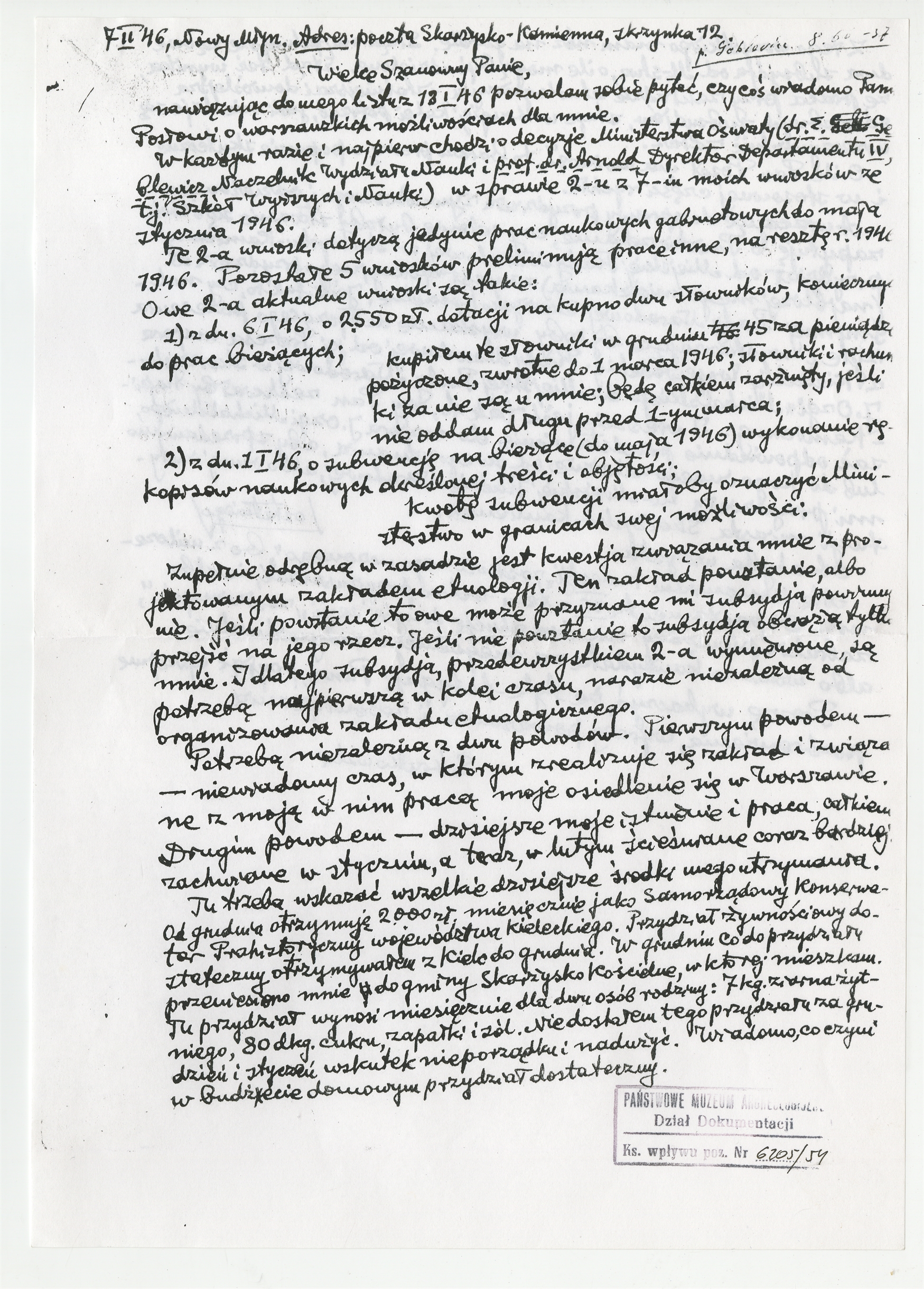Rękopis - kopia listu Stefana Krukowskiego do Jana Żołny-Manugiewicza z dnia 7 II [19]46 roku