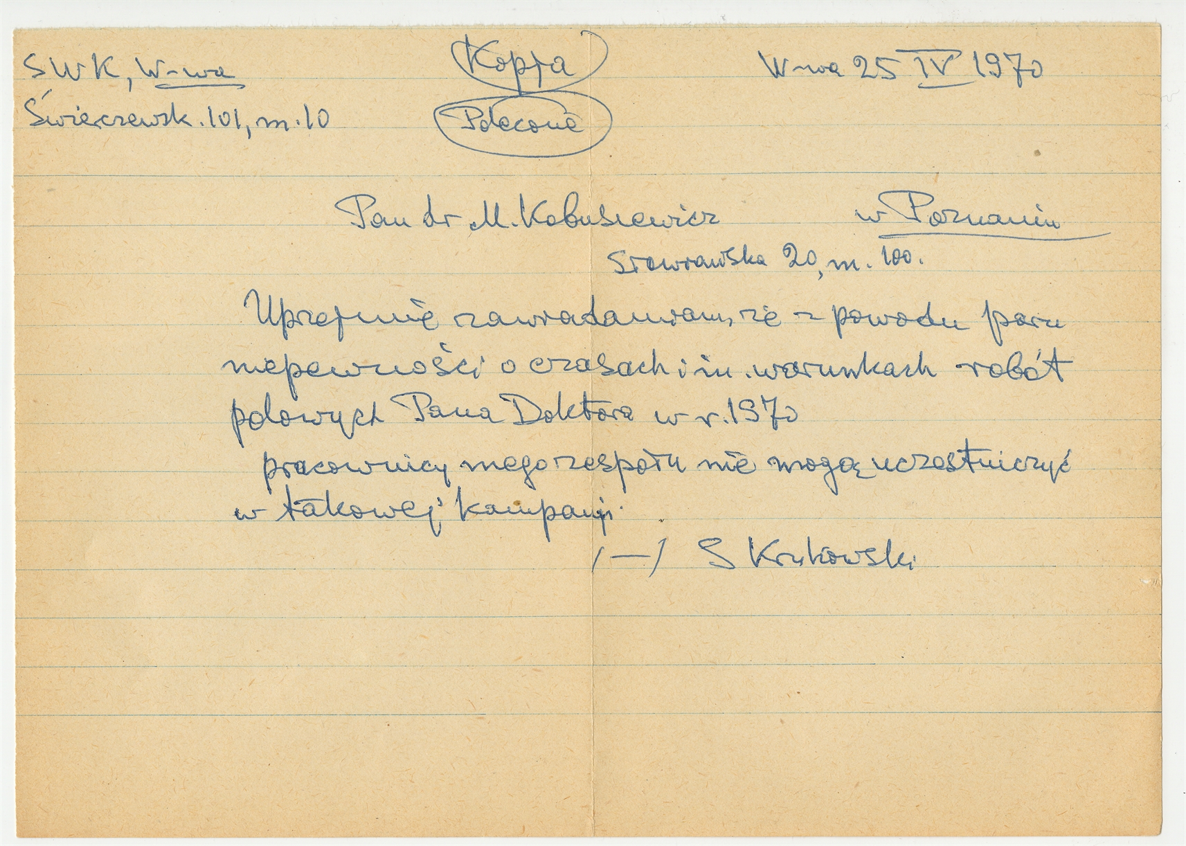 Rękopis - kopia listu Stefana Krukowskiego do Michała Kobusiewicza z dnia 25 IV 1970 roku