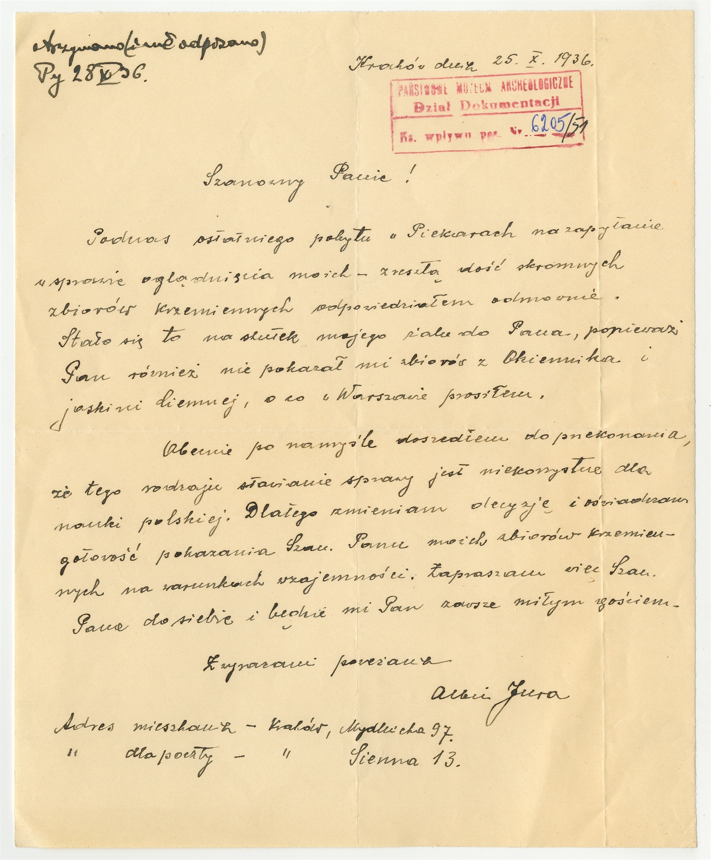 Rękopis - list Albina Jury do Stefana Krukowskiego z dnia 25 X 1937