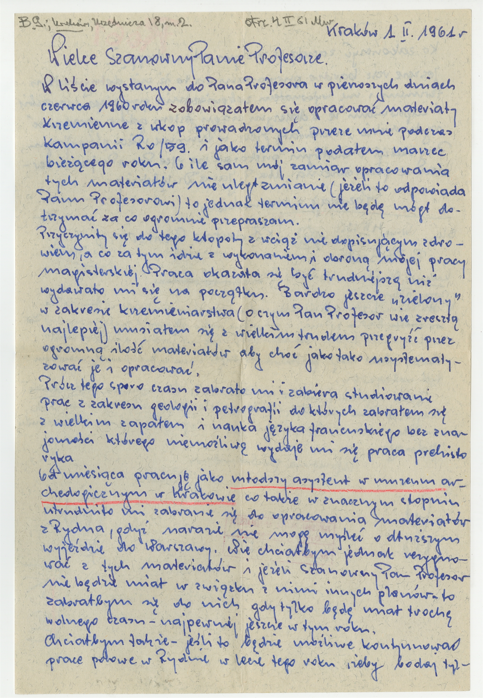 Rękopis - list Bolesława Gintera do Stefana Krukowskiego z dnia 1 II 1961 roku