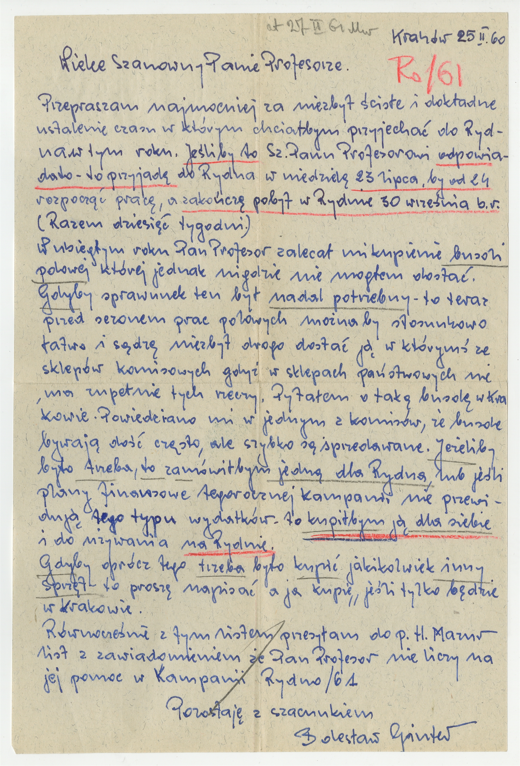 Rękopis - list Bolesława Gintera do Stefana Krukowskiego z dnia 25 II [19]60 roku