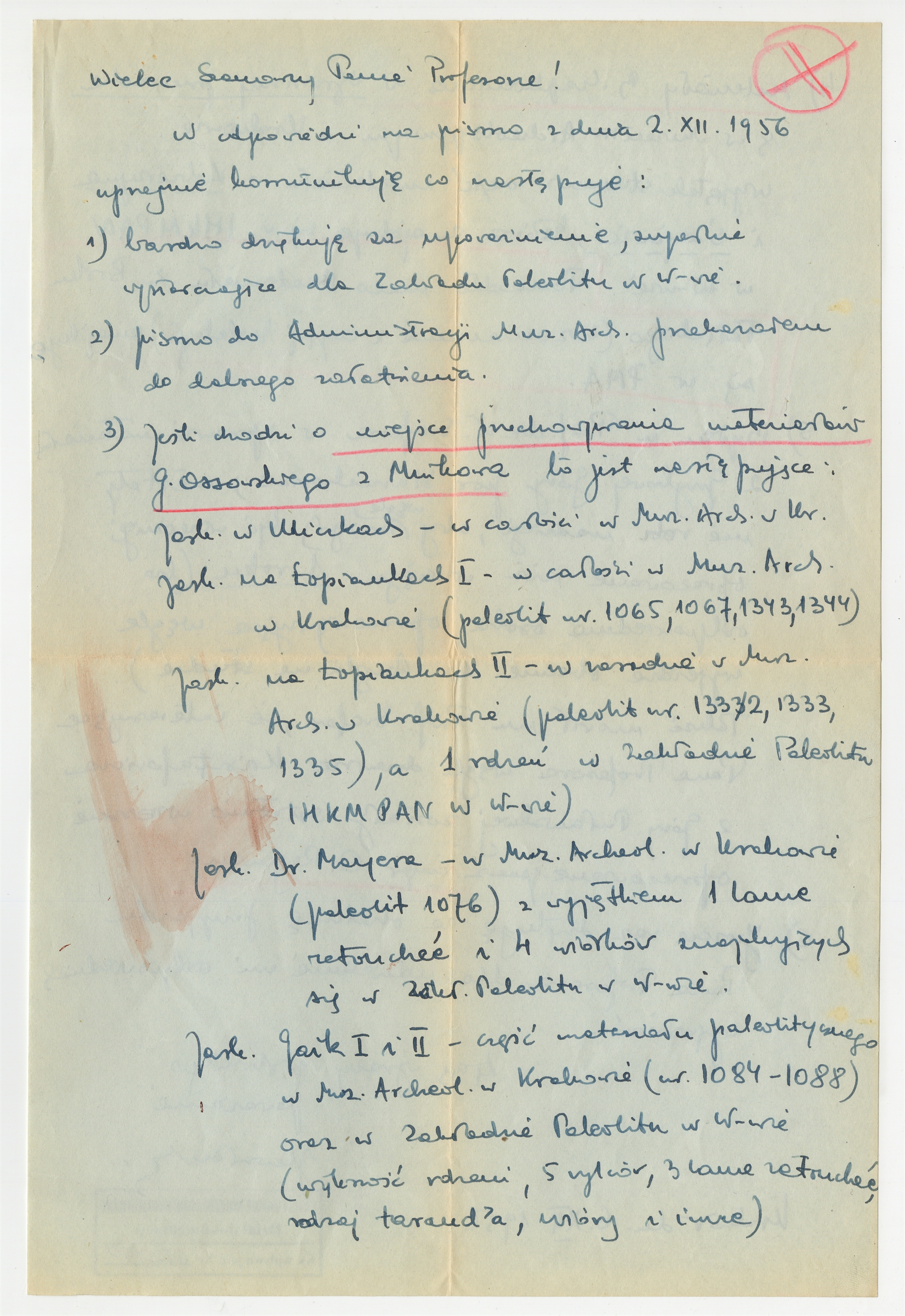 Rękopis - list do prof. Stefana Krukowskiego "W odpowiedzi na pismo z dnia 2 XII 1956 uprzejmie komunikuję…" Kraków 6 XII 1956