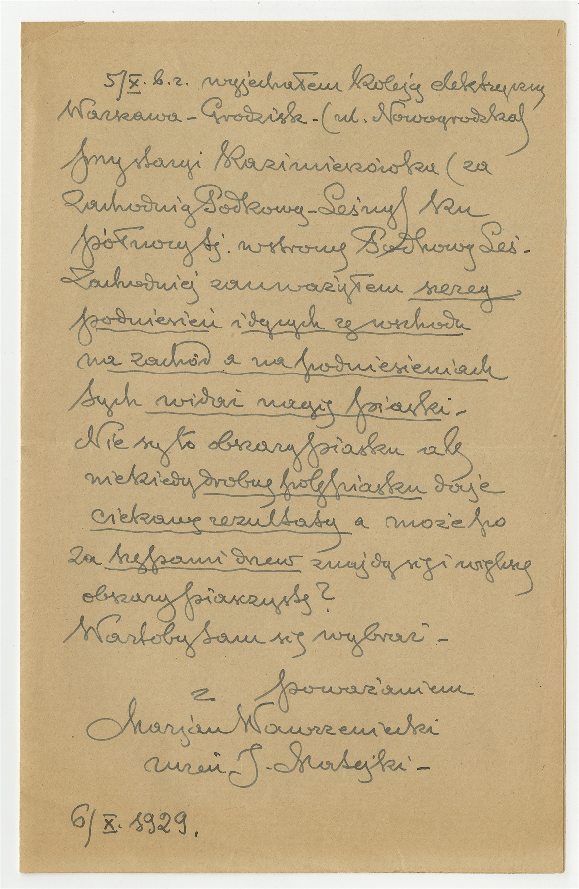 Rękopis – list do Stefana Krukowskiego w sprawie 3 narzędzi znalezionych we wsi Józefów 5-6 października 1929 r. str. 2: „Wyjechałem kolejką elektryczną(…)”