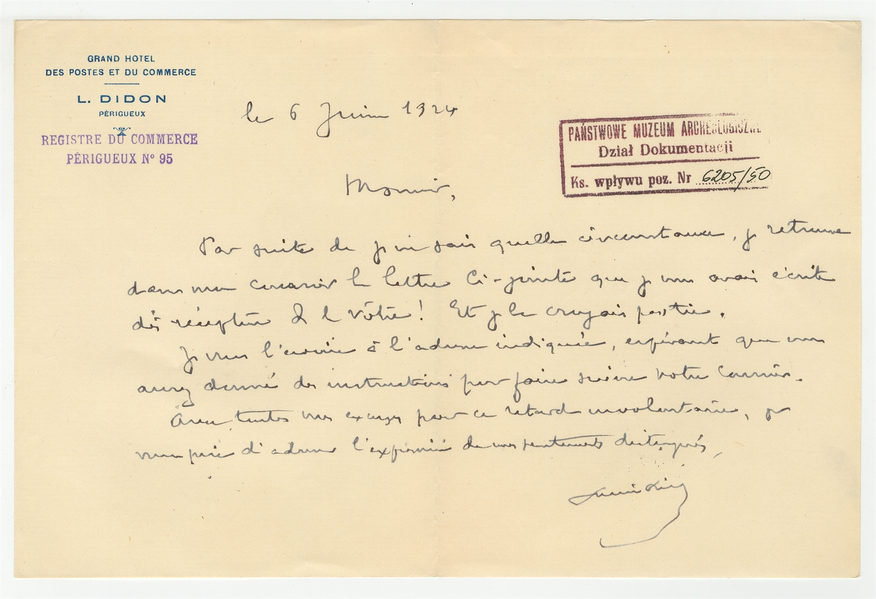 Rękopis - list do Stefana Krukowskiego z dn. 6 VI 1924 r. w języku francuskim nadawca niezidentyfikowany