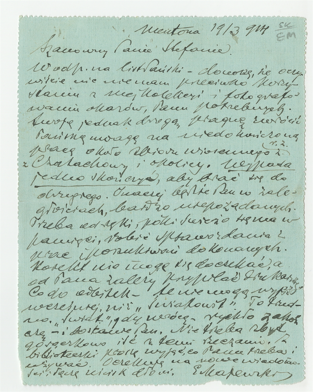 Rękopis - list Erazma Majewskiego do Stefana Krukowskiego z dnia 19 III [1]914 roku