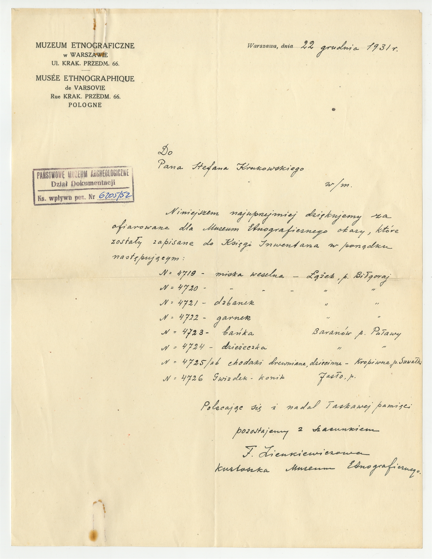 Rękopis - list F. Zienkiewiczowej z Muzeum Etnograficznego w Warszawie do Stefana Krukowskiego z dnia 22 grudnia 1931 roku