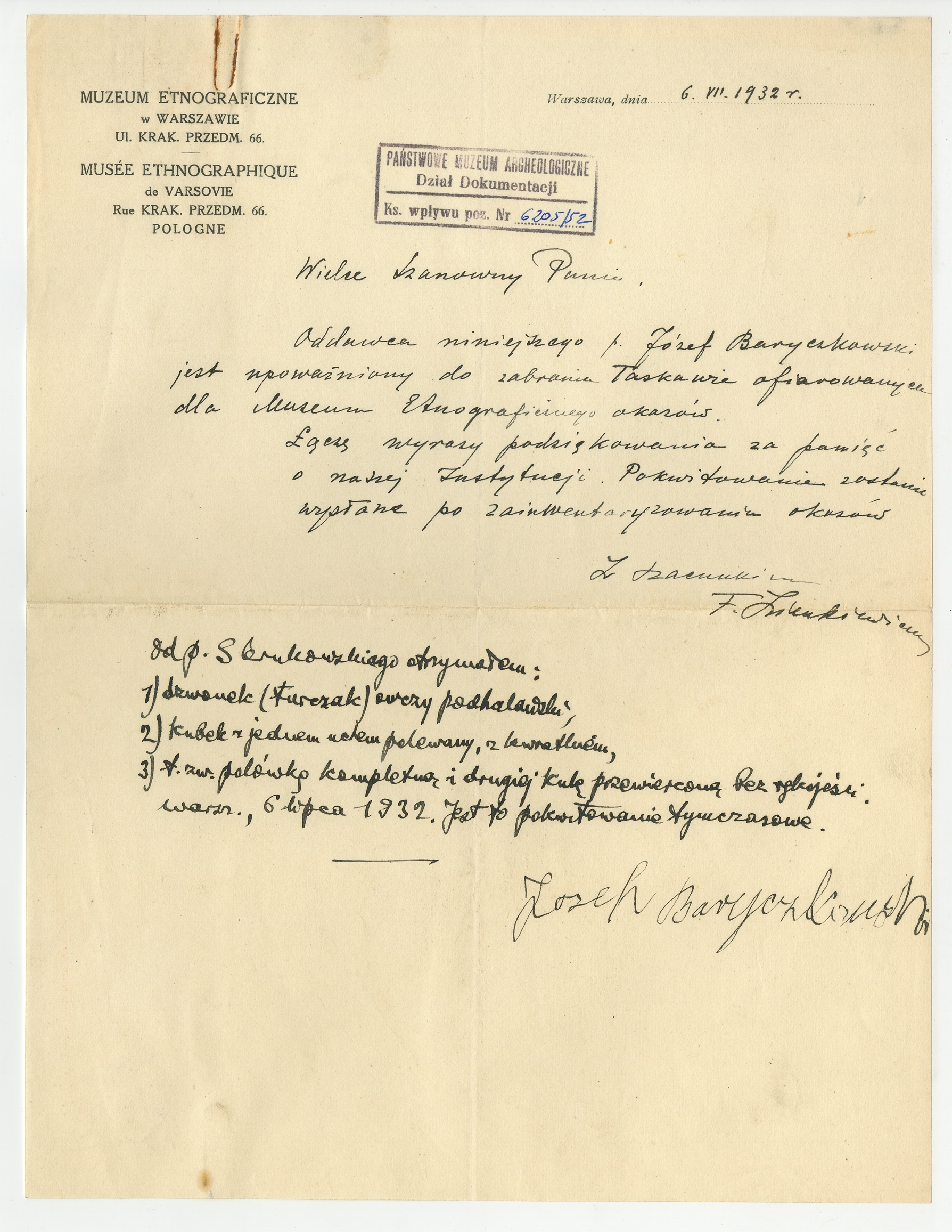 Rękopis - list F. Zienkiewiczowej z Muzeum Etnograficznego w Warszawie do Stefana Krukowskiego z dnia 6 VII 1932 roku. Na tej samej stronie ręką Krukowskiego wykaz przedmiotów pokwitowanych podpisem Józefa Baryczkowskiego