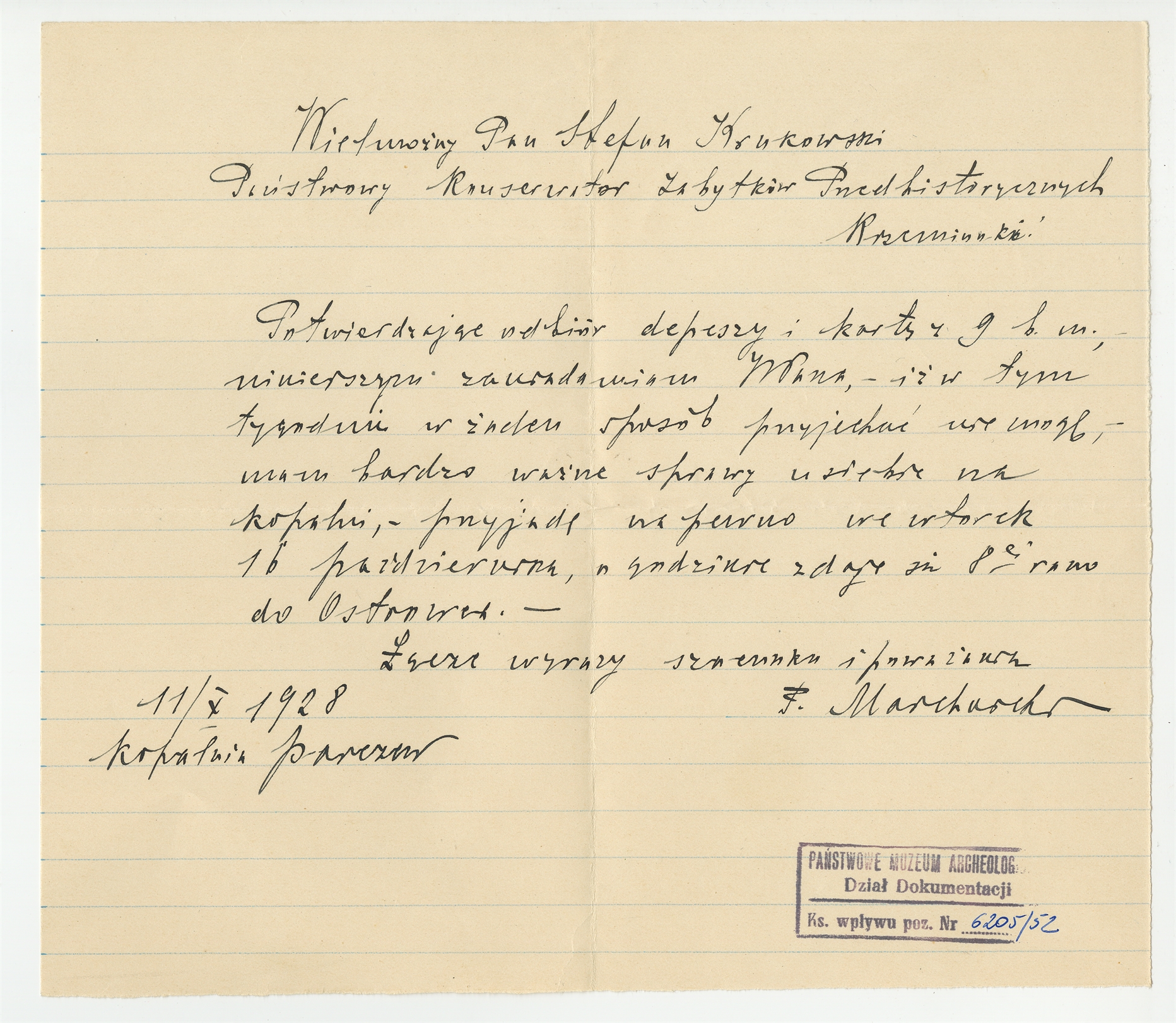 Rękopis - list Franciszka Marchwickiego do Stefana Krukowskiego z dnia 11 X 1928 roku