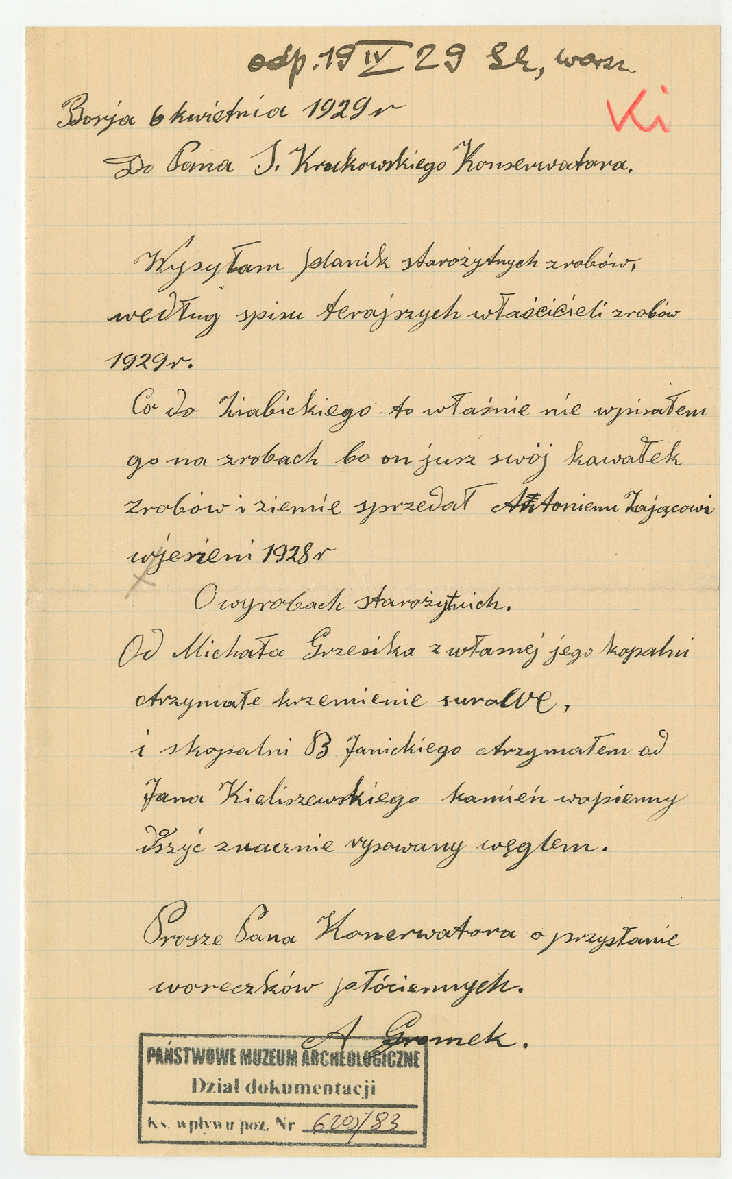 Rękopis - list A. Gromka do Stefana Krukowskiego z dnia 6 kwietnia 1929 roku wraz z załacznikiem w postaci planu "zrobów wsi Krzemionki"