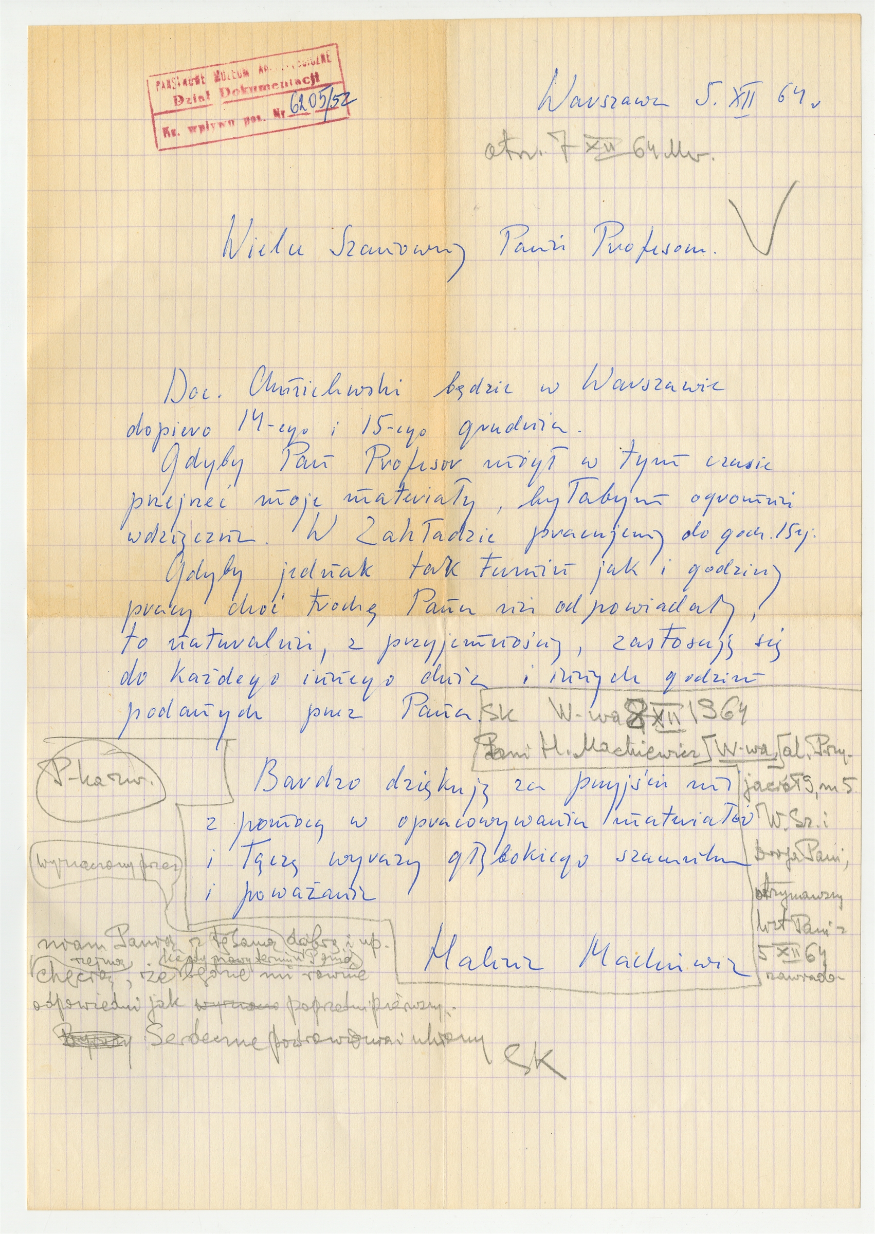 Rękopis - list Haliny Mackiewicz do Stefana Krukowskiego z dnia 5 XII [19]64 roku. Na tej samej stronie rękopis - brudnopis odpowiedzi S. Krukowskiego na list