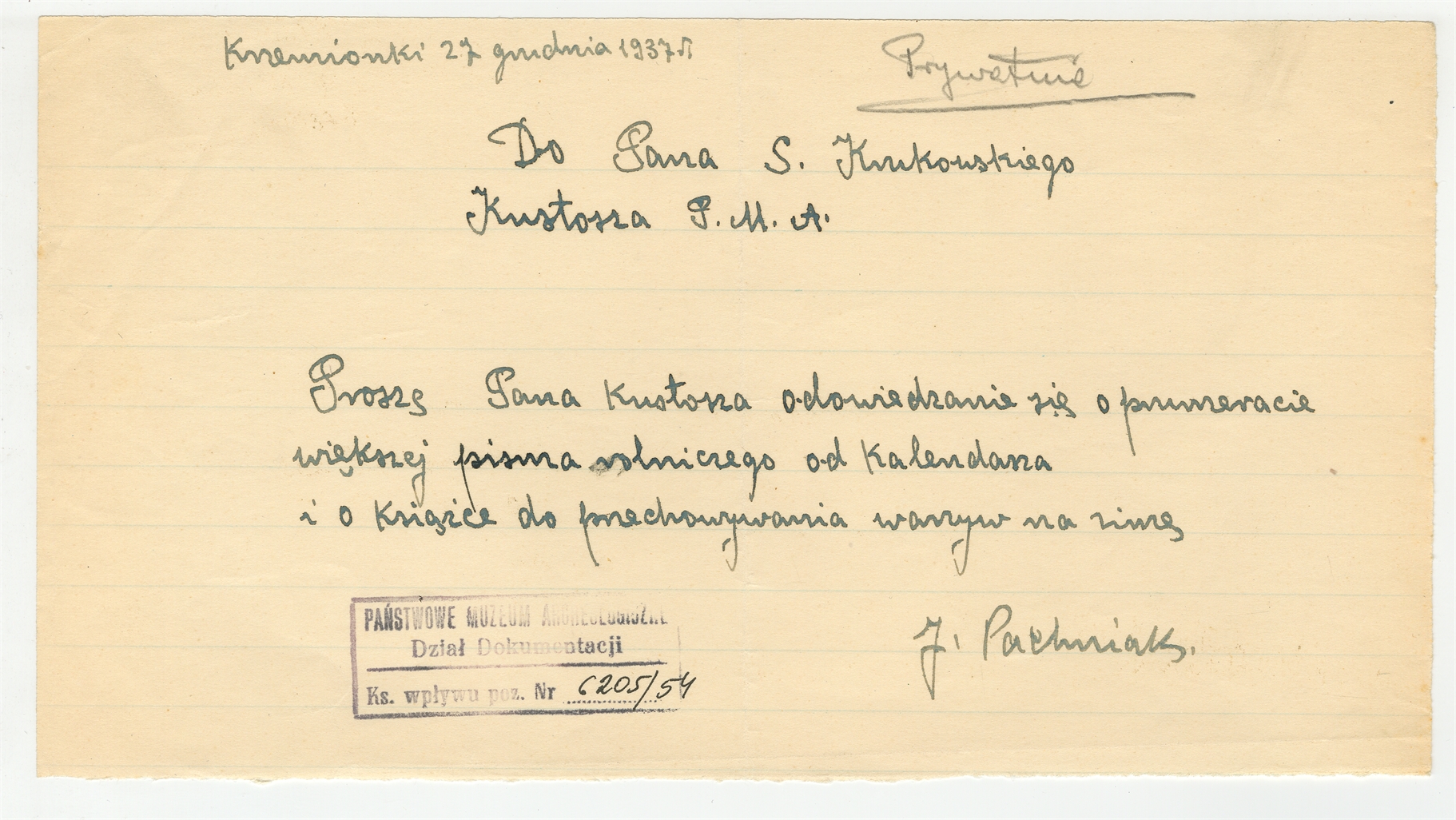 Rękopis - list J. Pachniaka do Stefana Krukowskiego z dnia 27 grudnia 1937 roku