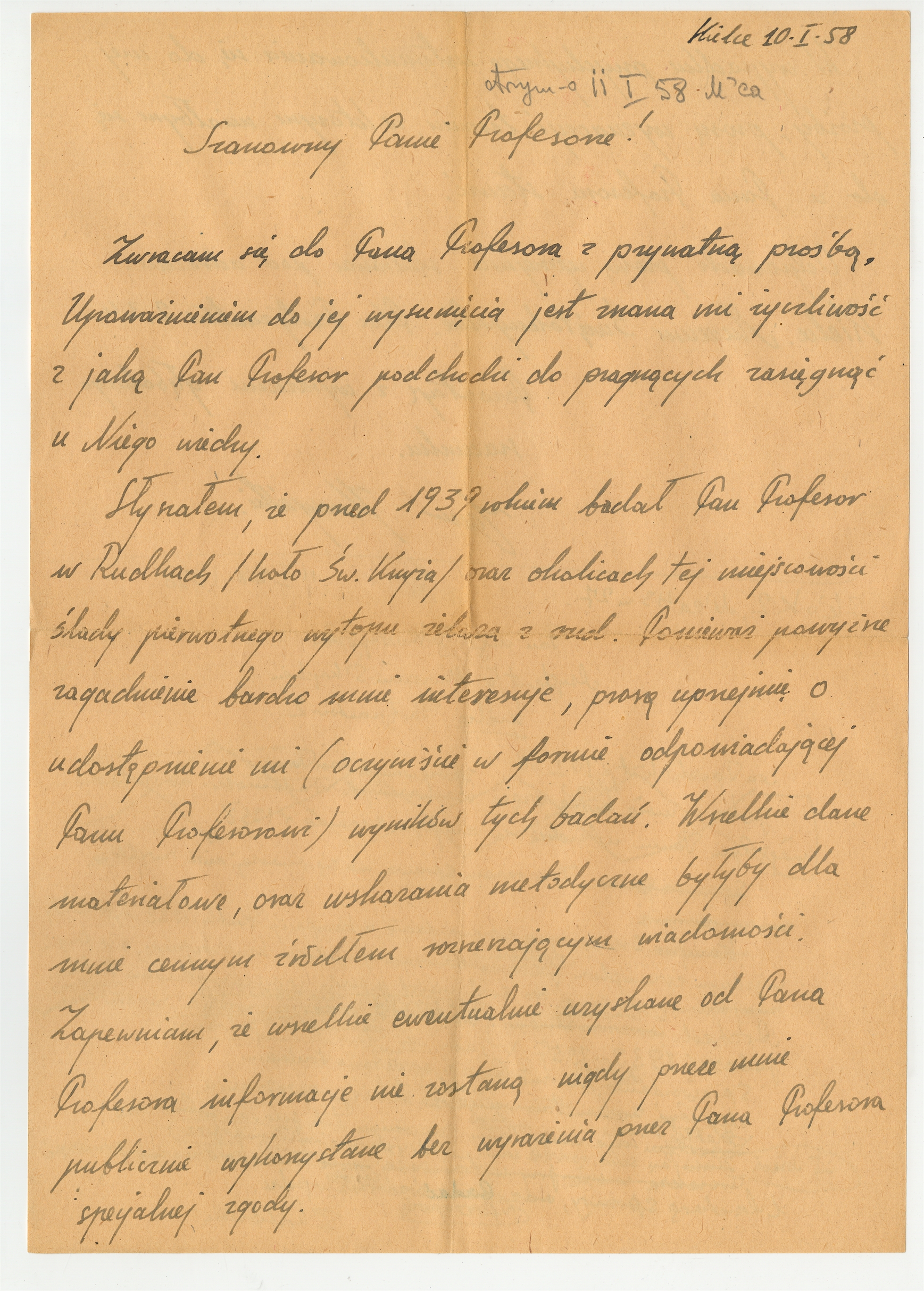 Rękopis - list Jana Kuczyńskiego do Stefana Krukowskiego z dnia 10 I [19]58 roku
