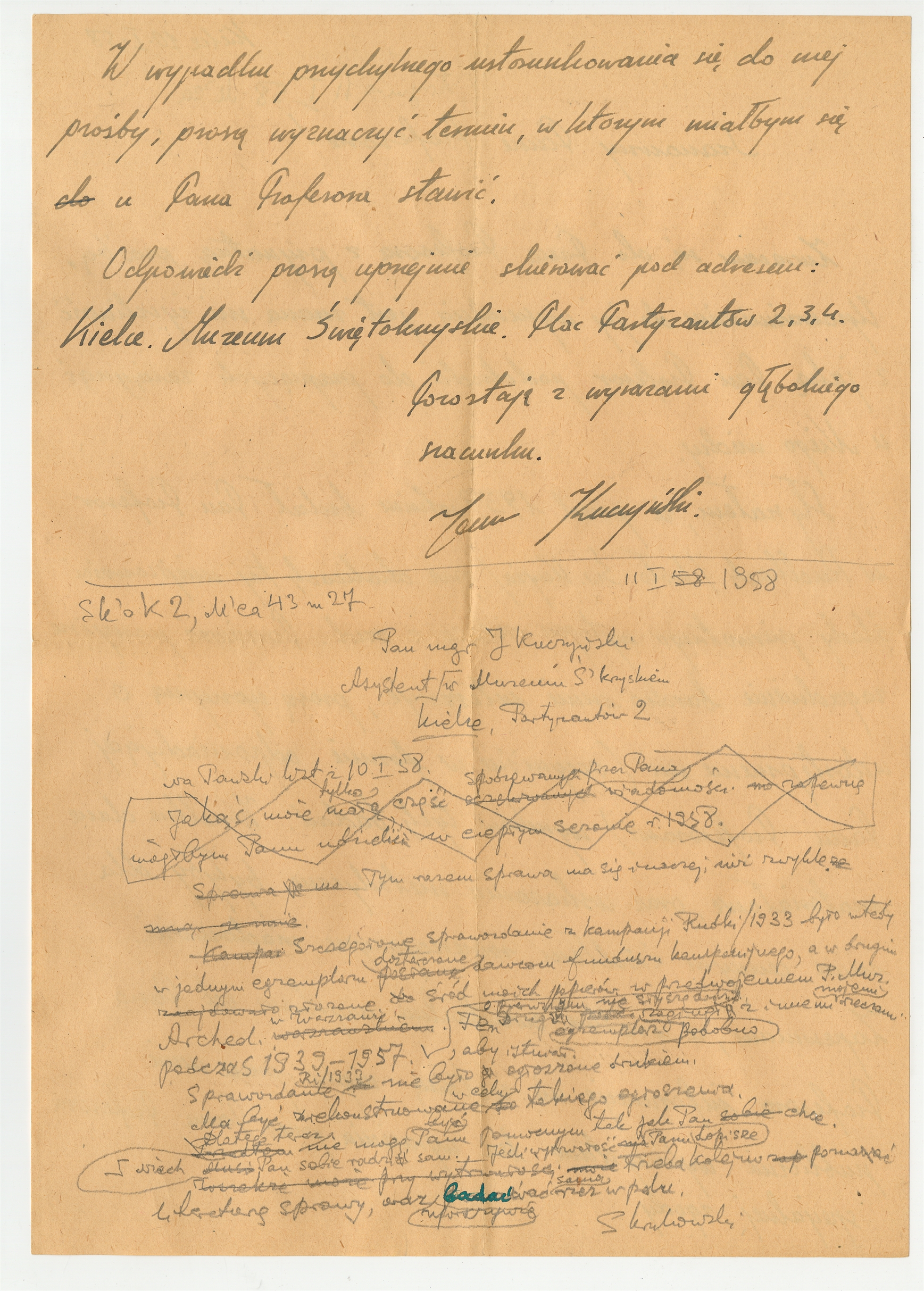 Rękopis - list Jana Kuczyńskiego do Stefana Krukowskiego z dnia 10 I [19]58 roku (cd). Na tej samej stronie rękopis - brudnopis odpowiedzi Stefana Krukowskiego z dnia 11 I 1958 roku na ten list
