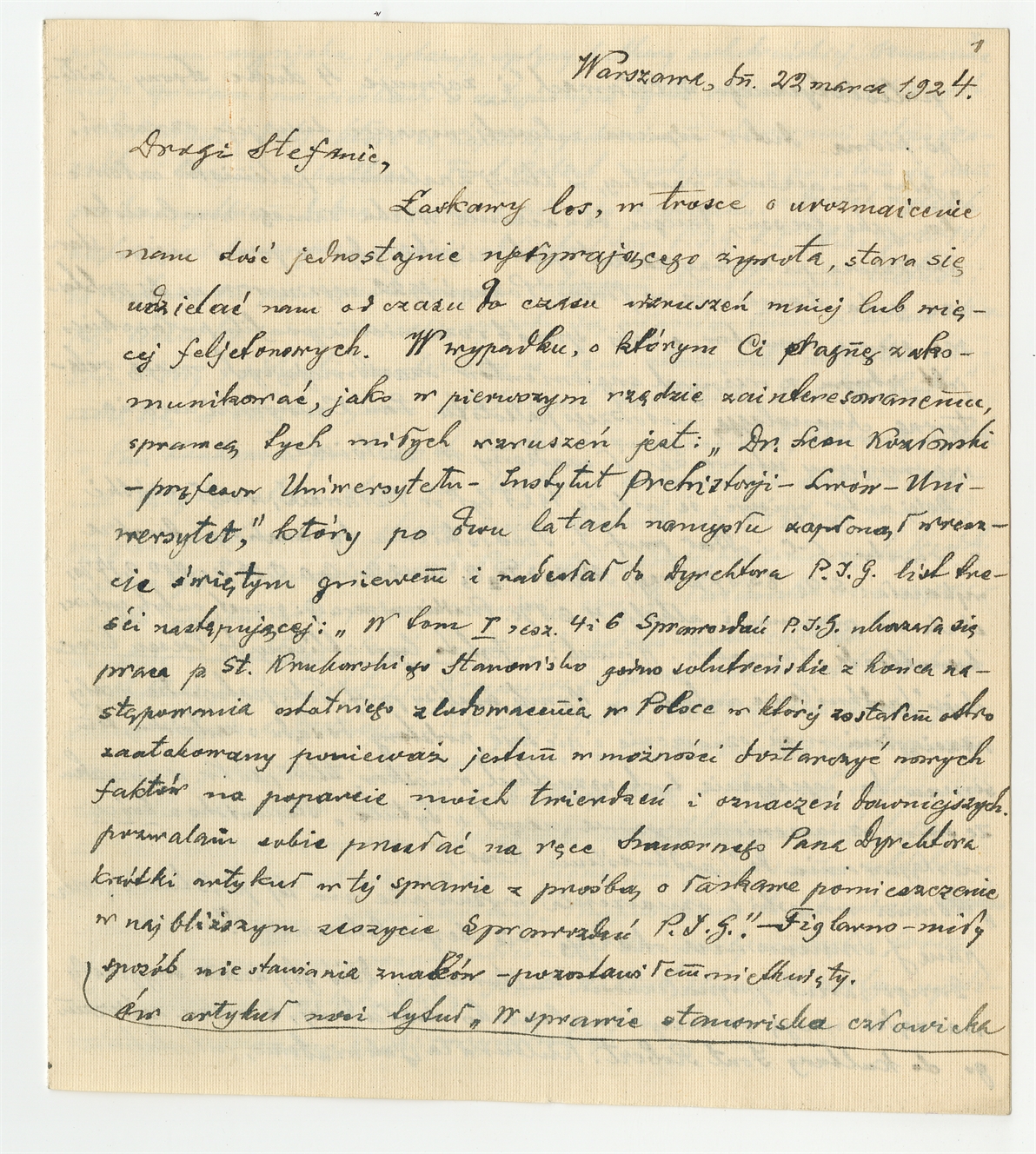 Rękopis - list Jana Samsonowicza do Stefana Krukowskiego z dnia 22 marca 1924 roku