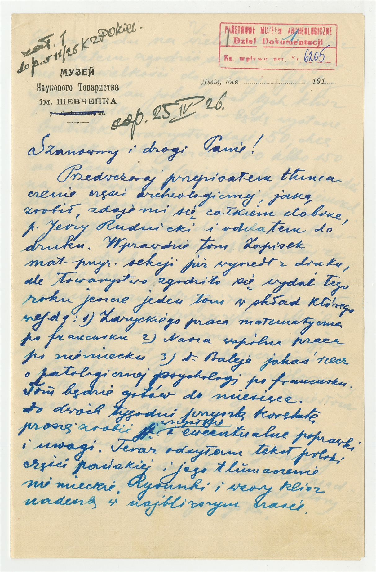 Rękopis - list Jerzego Polańskiego do Stefana Krukowskiego z dnia 11 IV 1926 roku