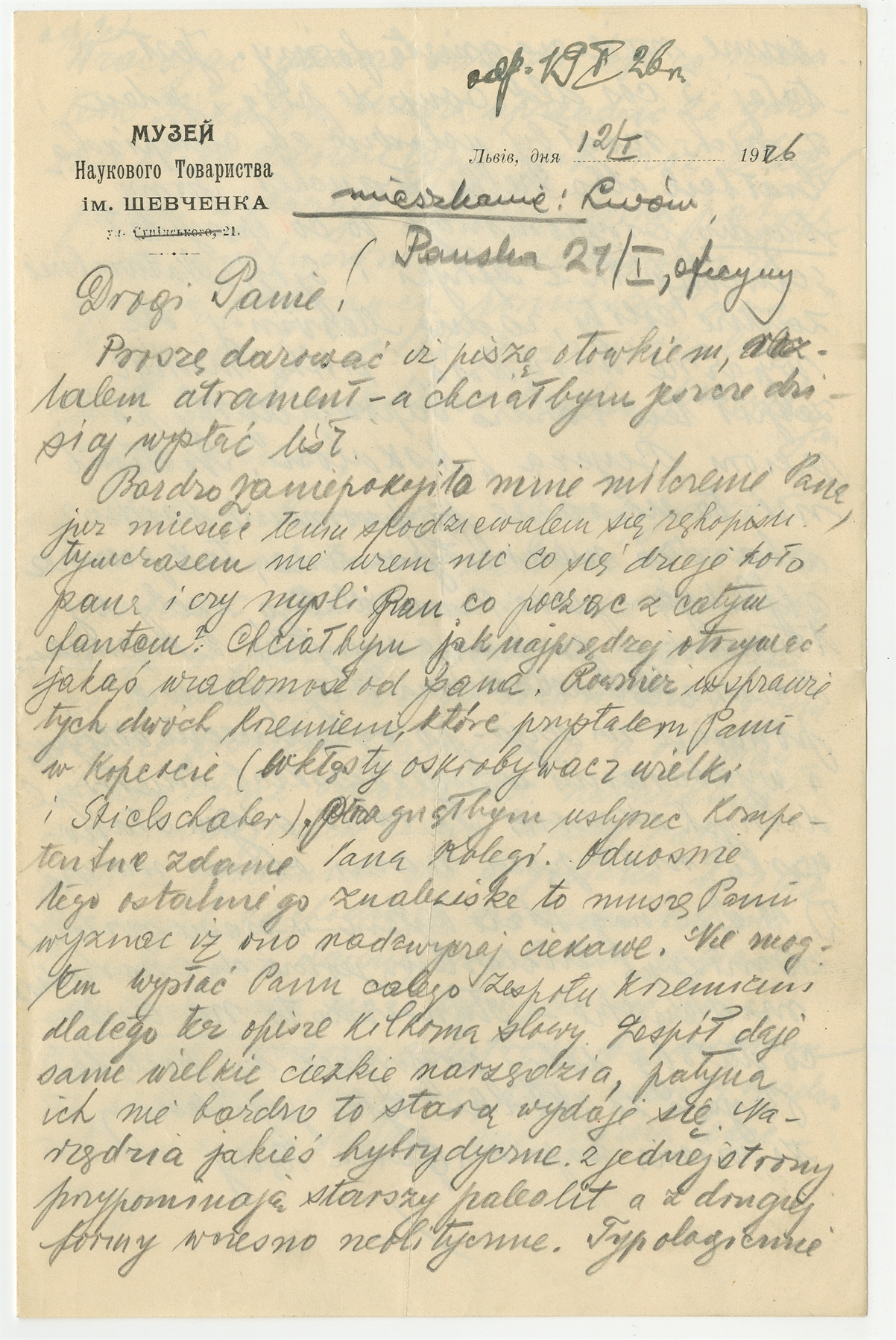 Rękopis - list Jerzego Polańskiego do Stefana Krukowskiego z dnia 12 I 1926 roku