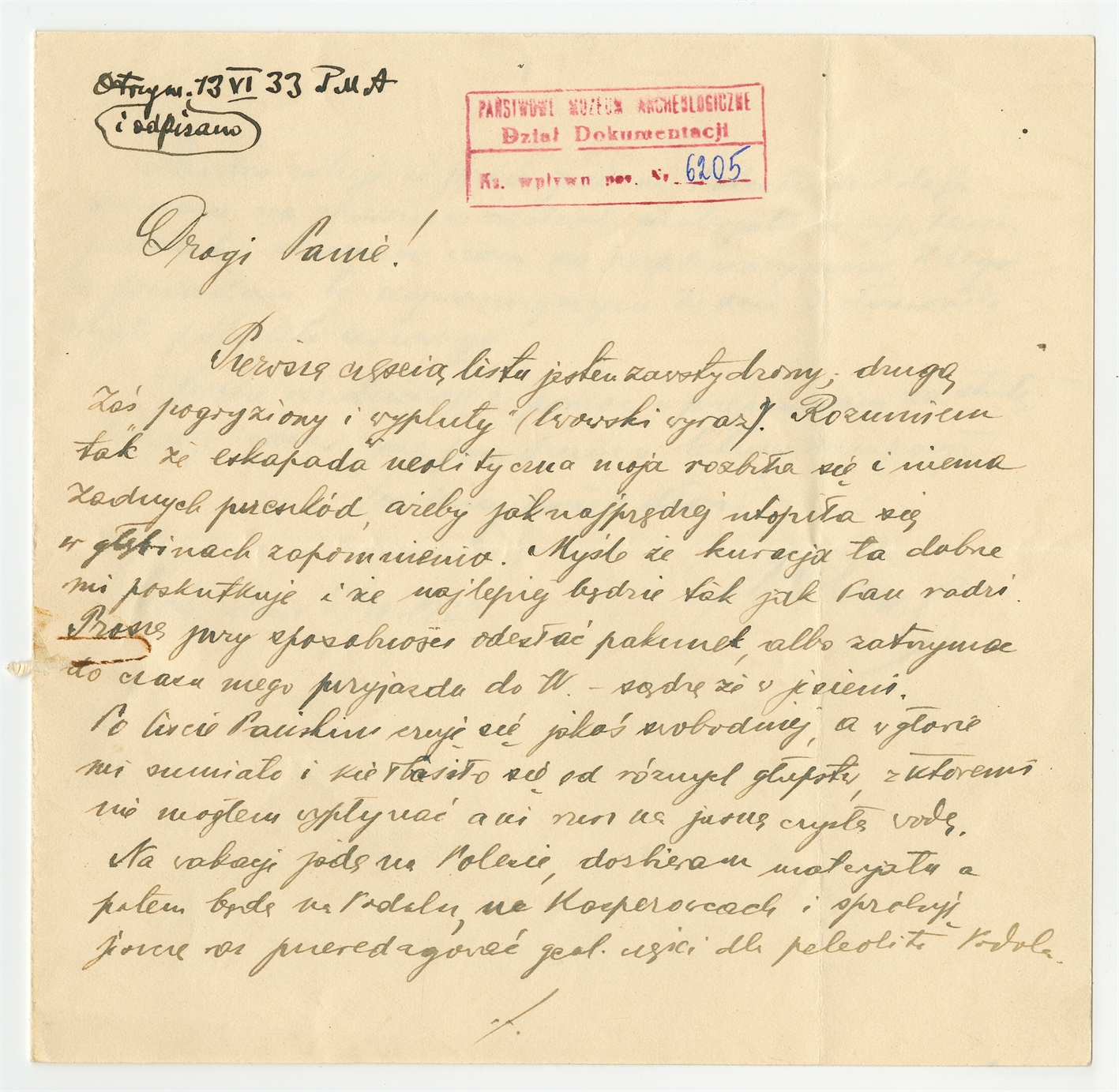 Rękopis - list Jerzego Polańskiego do Stefana Krukowskiego z dnia 5 VI 1933 roku