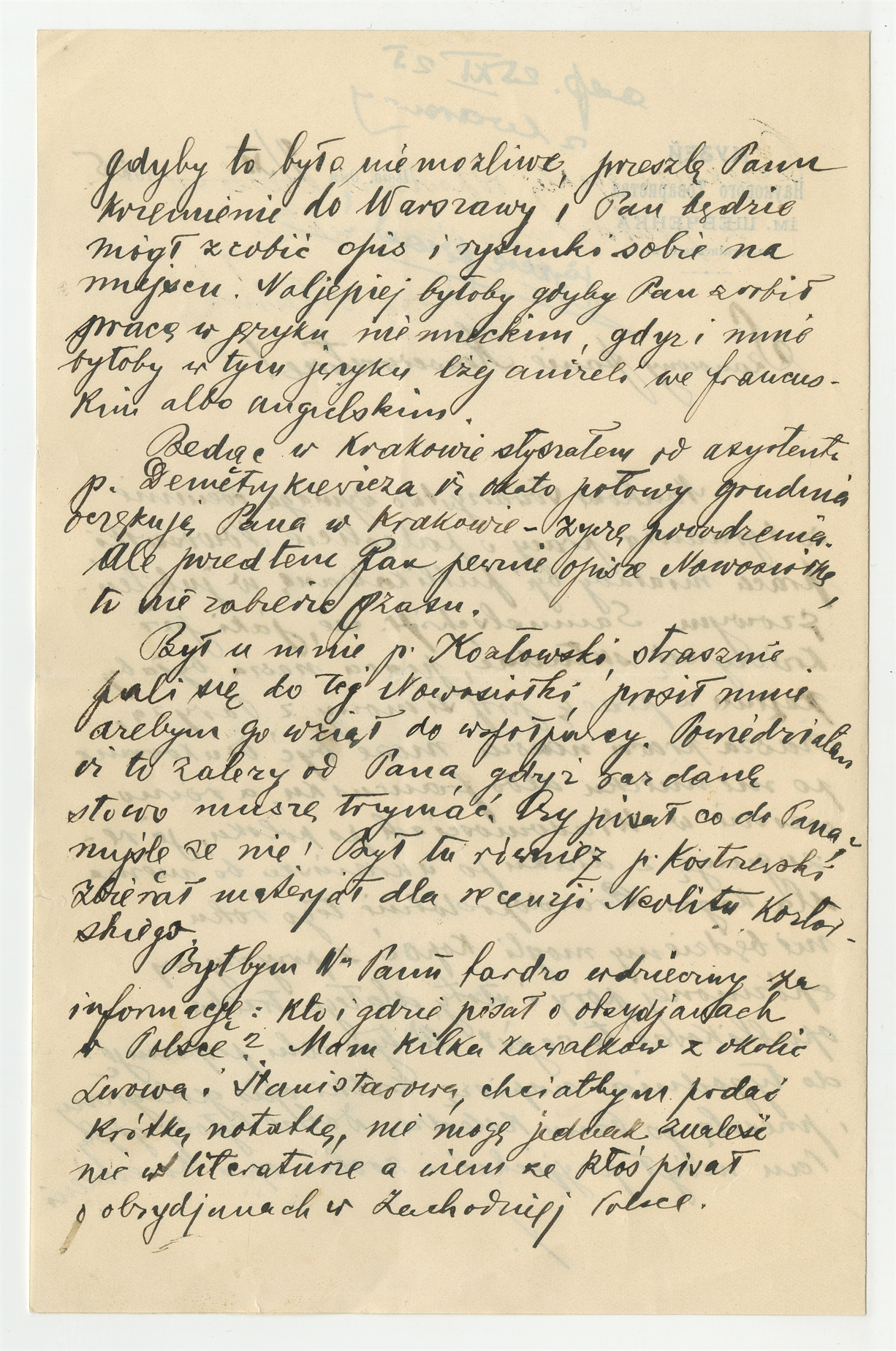 Rękopis - list Jerzego Polańskiego do Stefana Krukowskiego z dnia 9 XI 1925 roku (cd)