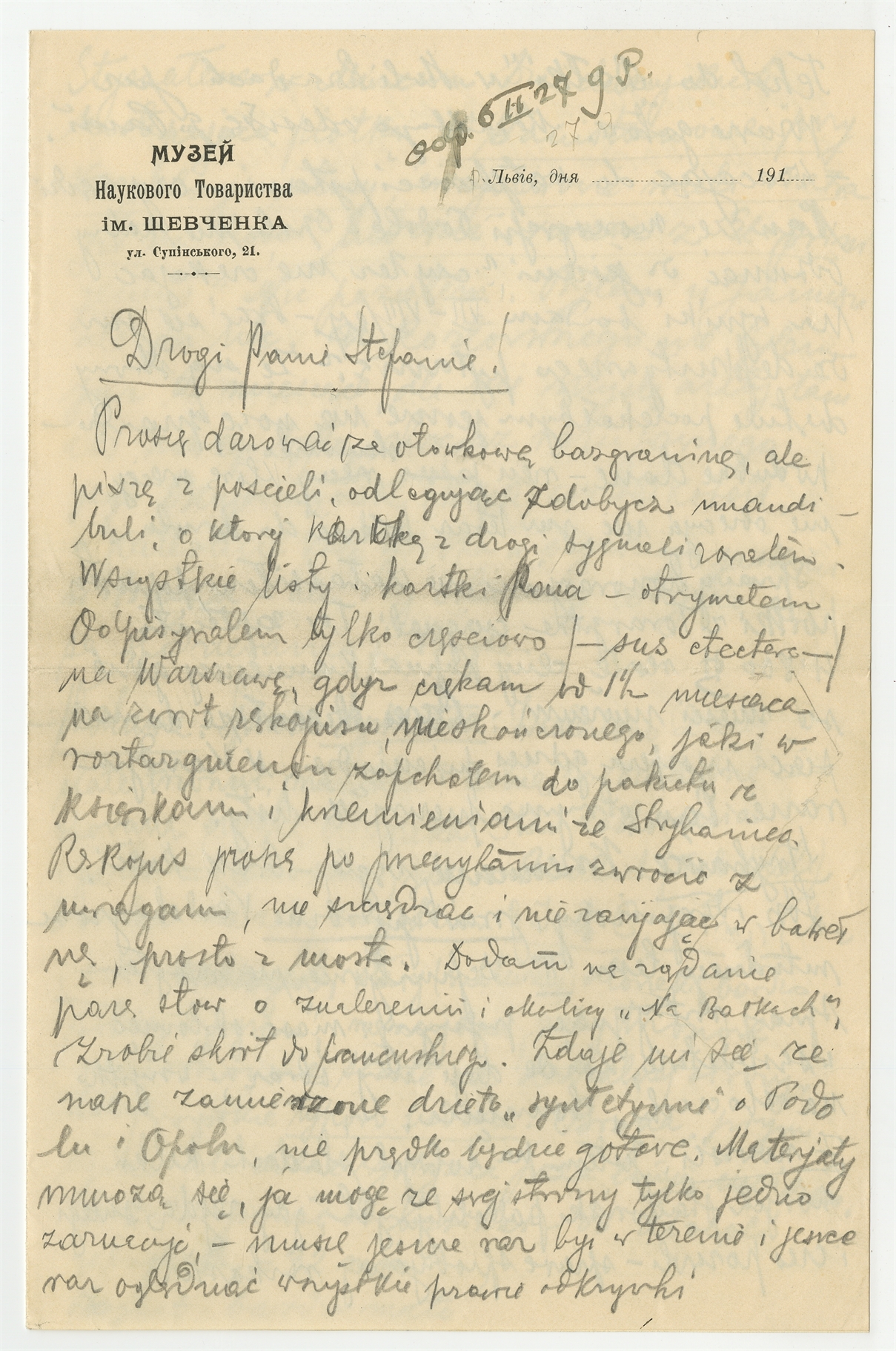 Rękopis - list Jerzego Polańskiego do Stefana Krukowskiego z przełomu roku 1926/1927