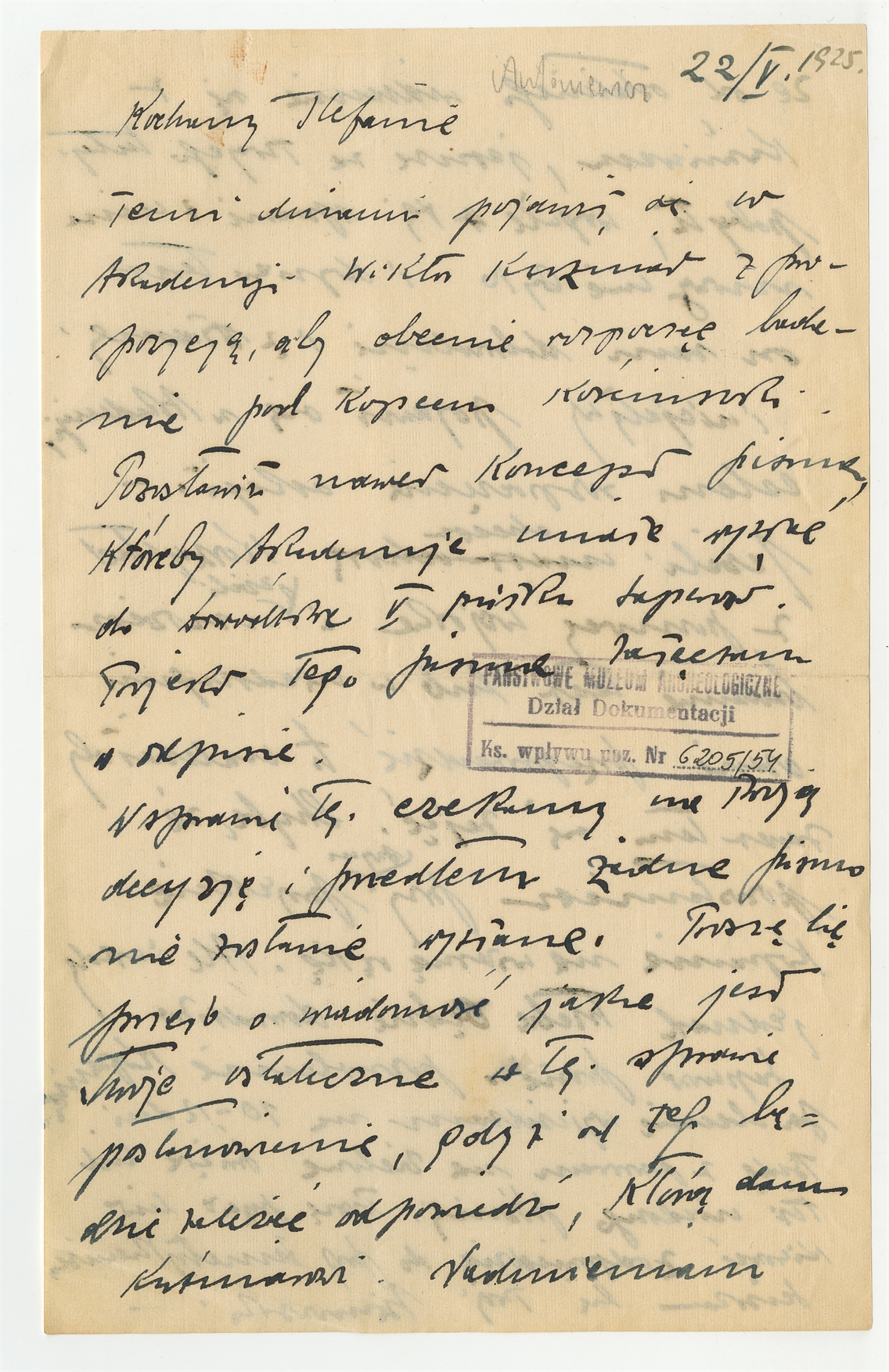 Rękopis - list Józefa Żurowskiego do Stefana Krukowskiego z dnia 22 V1925 roku