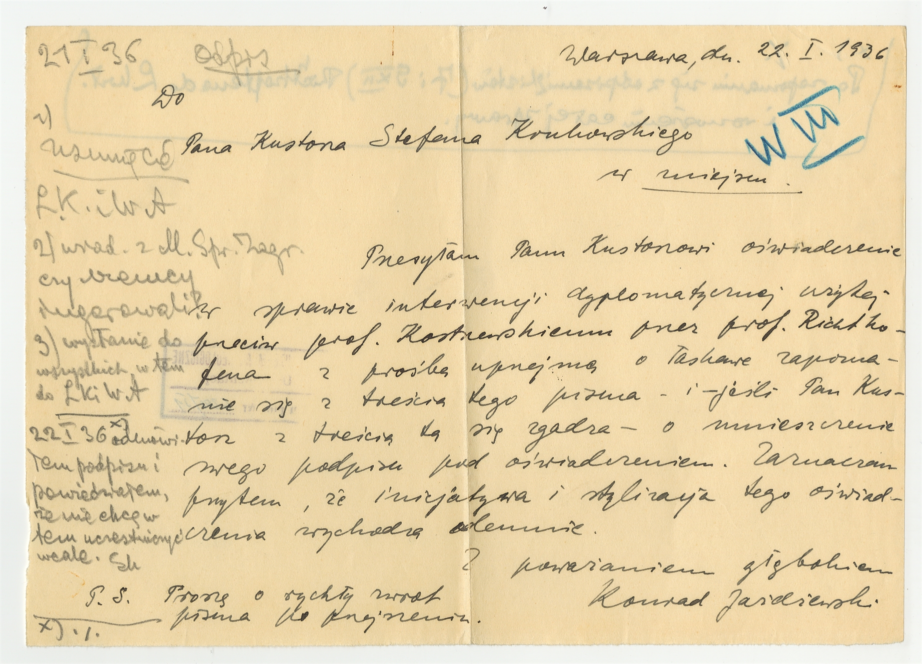 Rękopis - list Konrada Jażdżewskiego do Stefana Krukowskiego z dnia 22 I 1936 roku z notatkami ręką Stefana Krukowskiego dotyczącymi treści listu