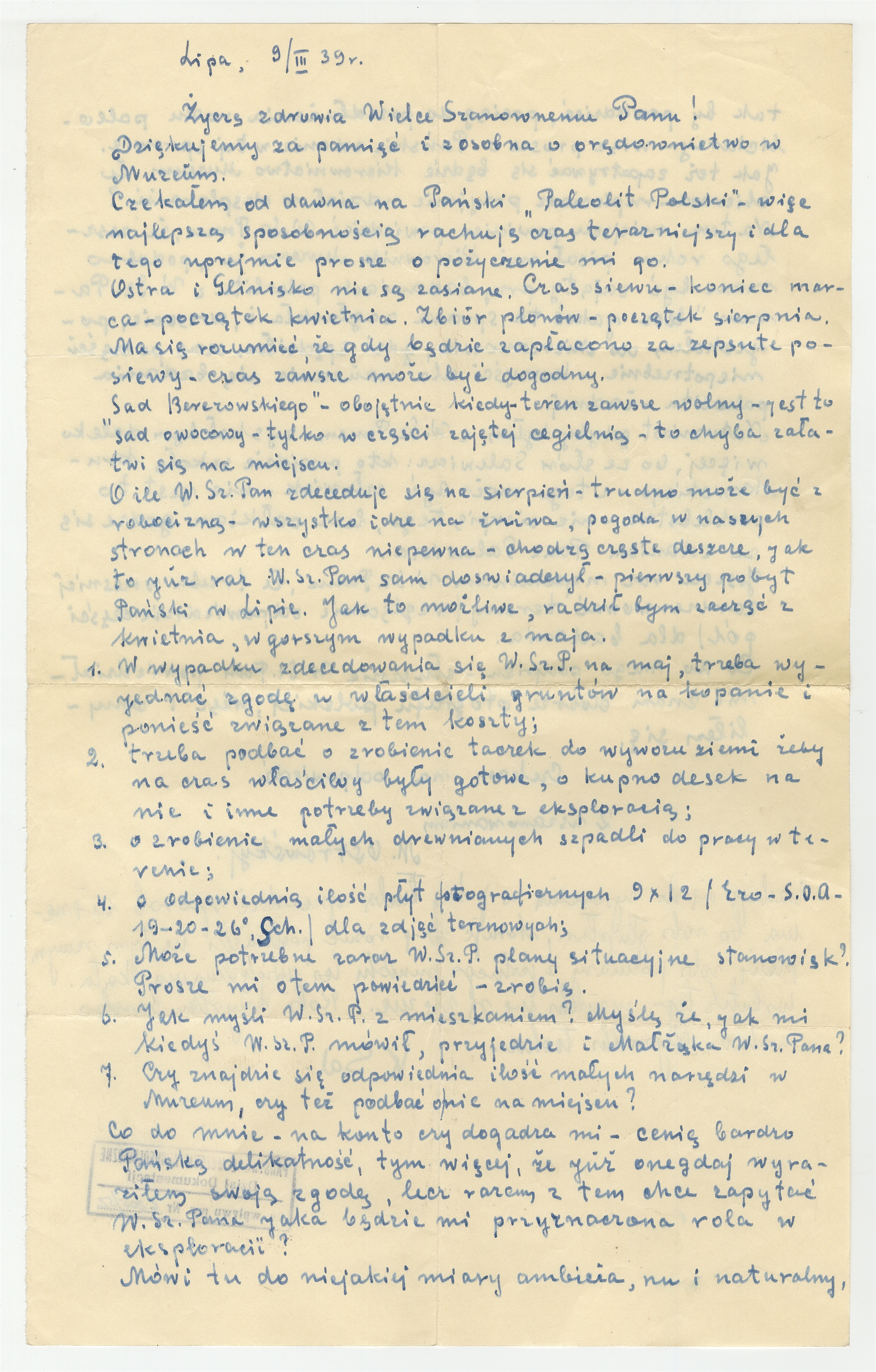 Rękopis - list M Ostrowskiego do Stefana Krukowskiego z dnia 9 III [19]39 roku.