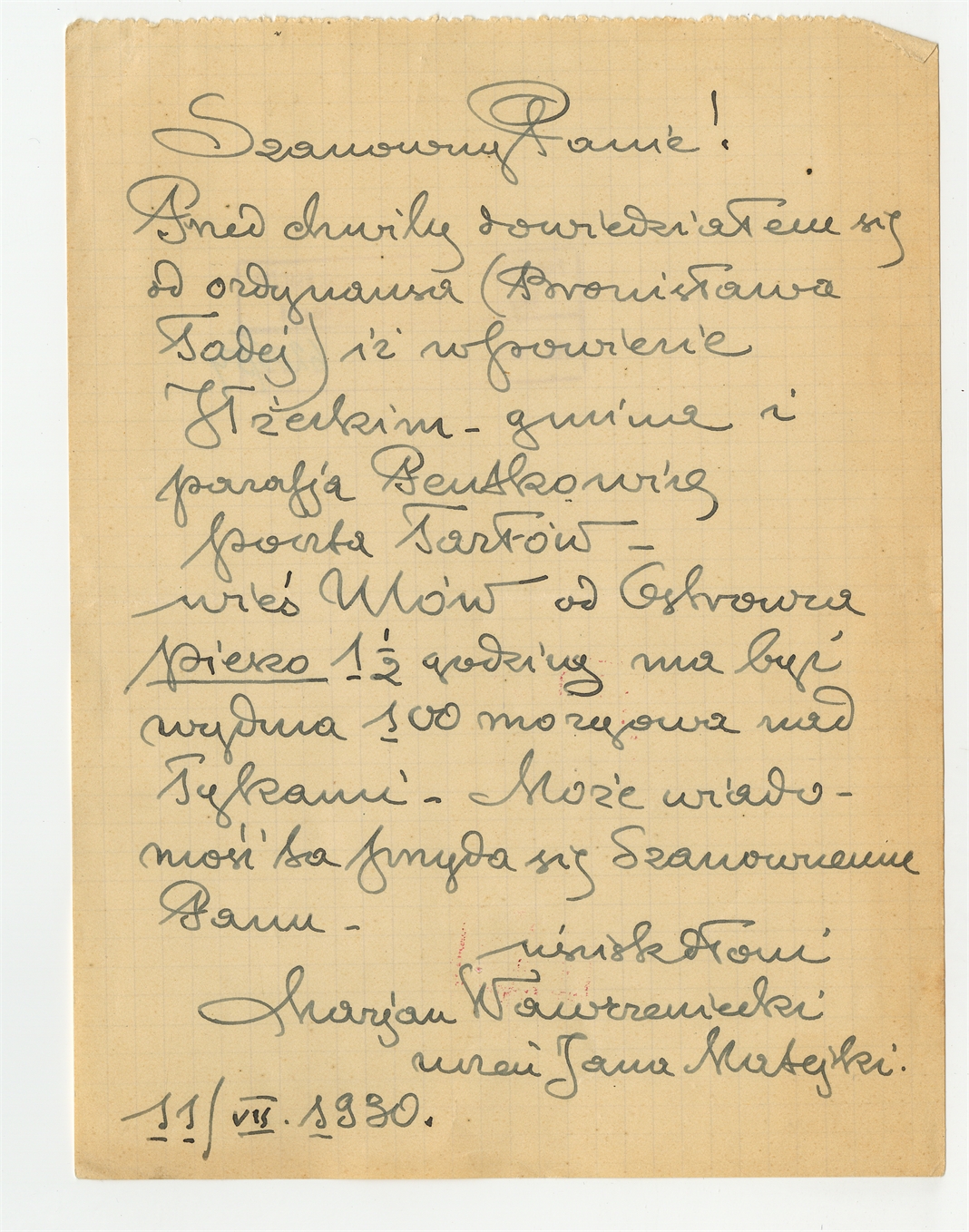 Rękopis - list Mariana Wawrzenieckiego do Stefana Krukowskiego z dnia 11 VII 1930 roku