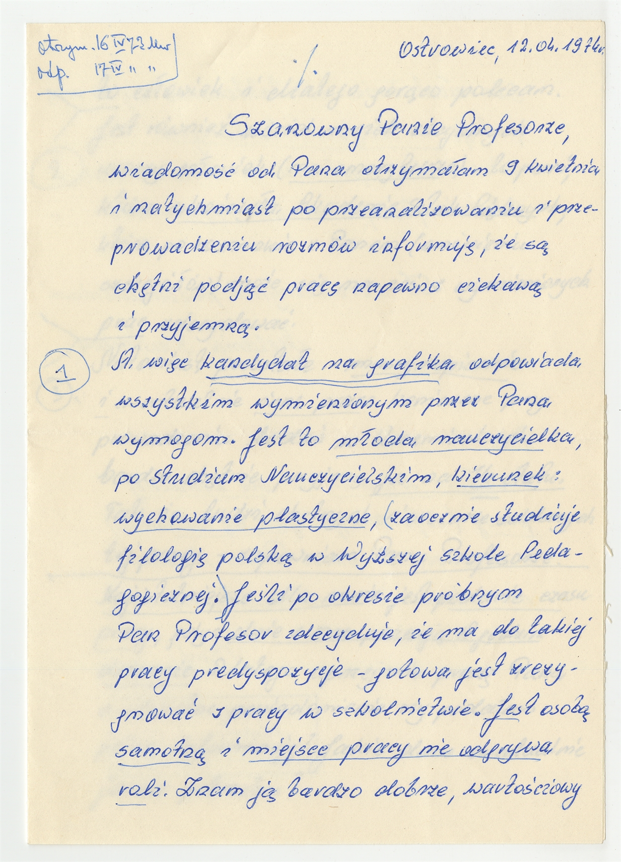 Rękopis - list Melanii Kustrzepy do Stefana Krukowskiego z dnia 12.04.1974 roku