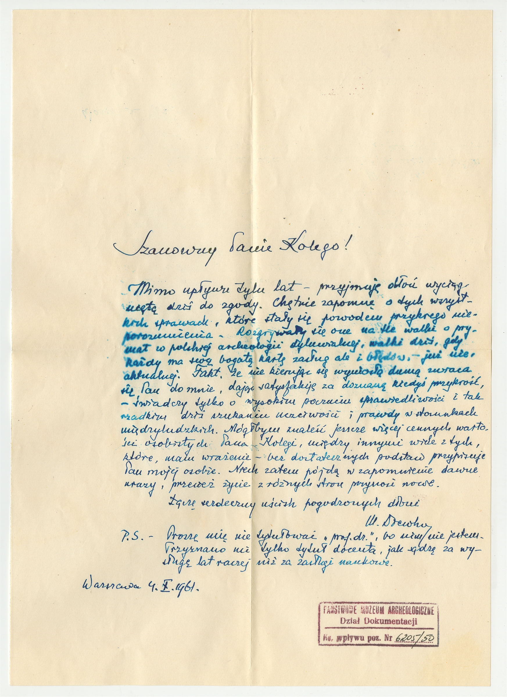 Rękopis - list Michała Drewko do Stefana Krukowskiego z dn. 4 X 1961 r.