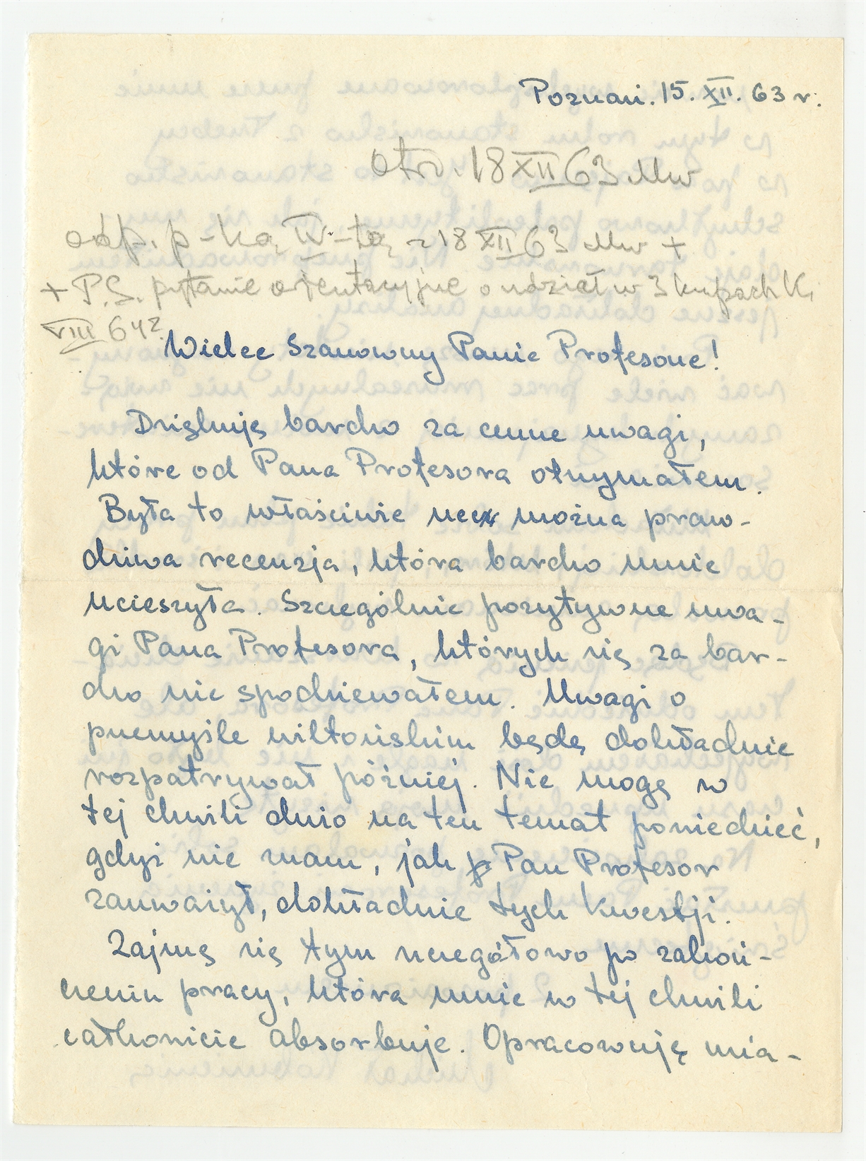 Rękopis - list Michała Kobusiewicza do Stefana Krukowskiego z dnia 15 XII [19]63 roku