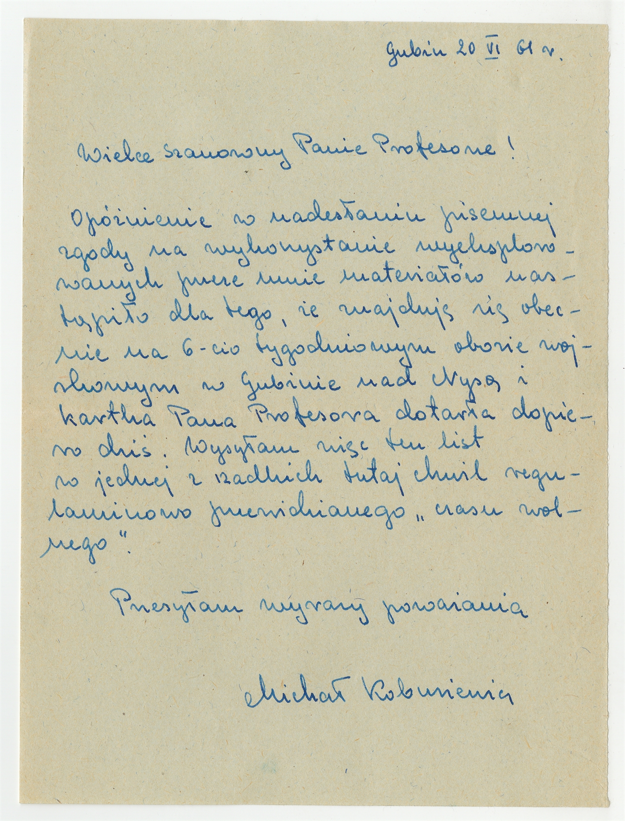 Rękopis - list Michała Kobusiewicza do Stefana Krukowskiego z dnia 20 VI [19]61 roku