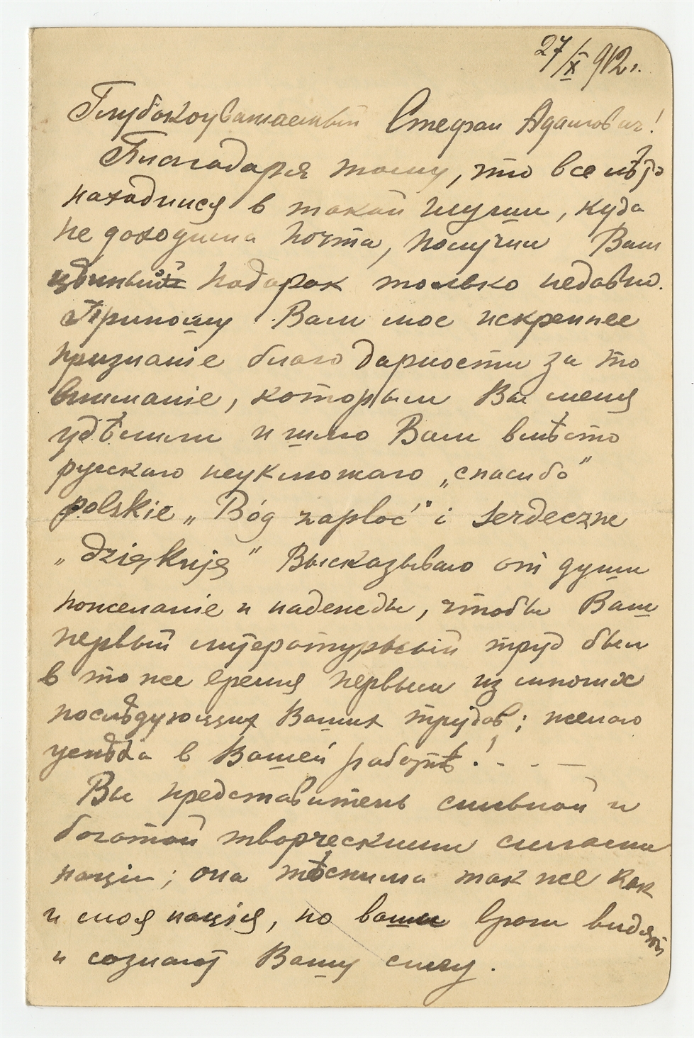 Rękopis - list NN (podpis nieczytelny) w języku rosyjskim do Stefana Krukowskiego z dnia 27 X [1]912 roku