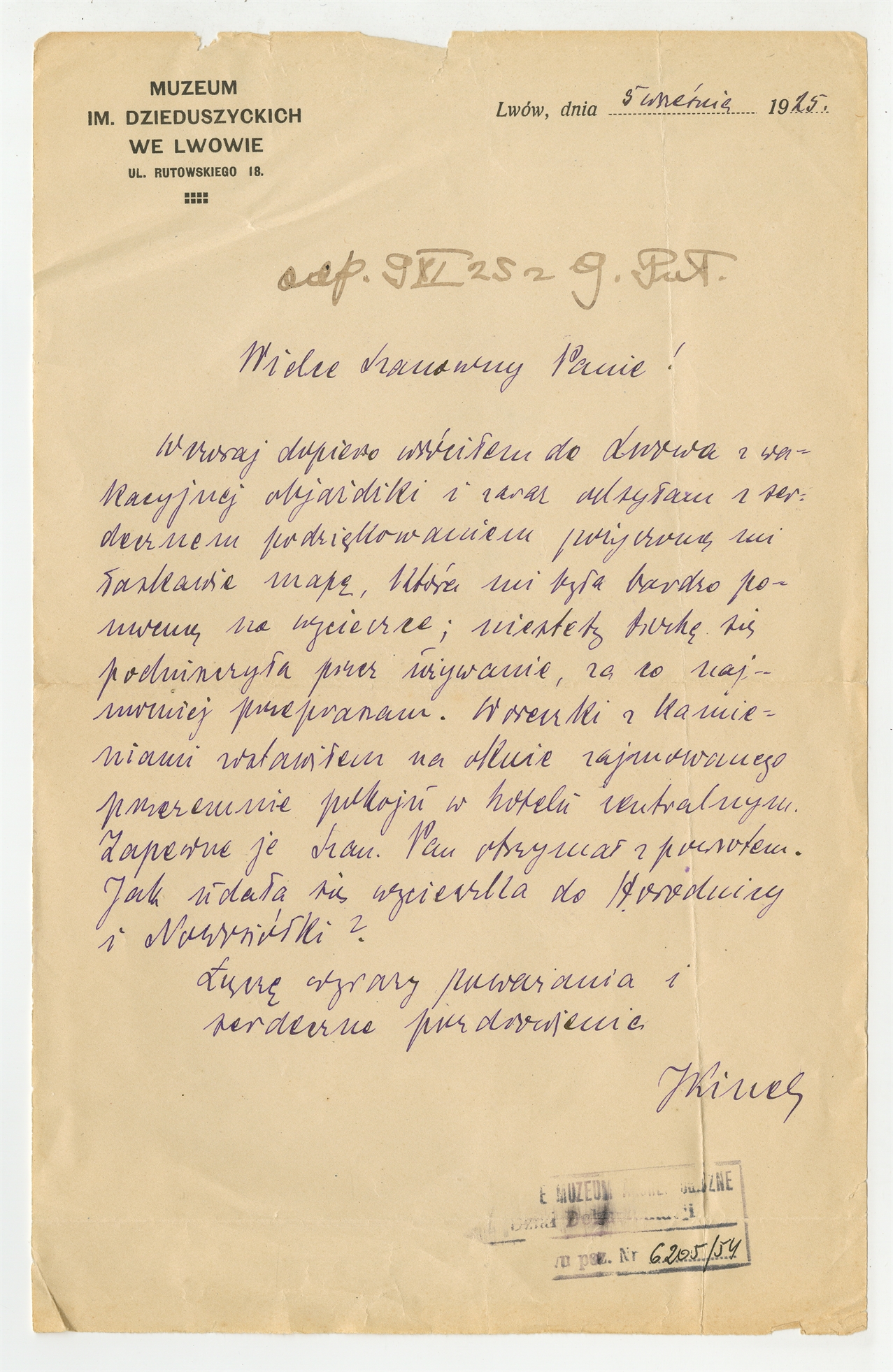 Rękopis - list NN (podpis nieczytelny) z Muzeum Dzieduszyckich we Lwowie do Stefana Krukowskiego z dnia 5 września 1925 roku