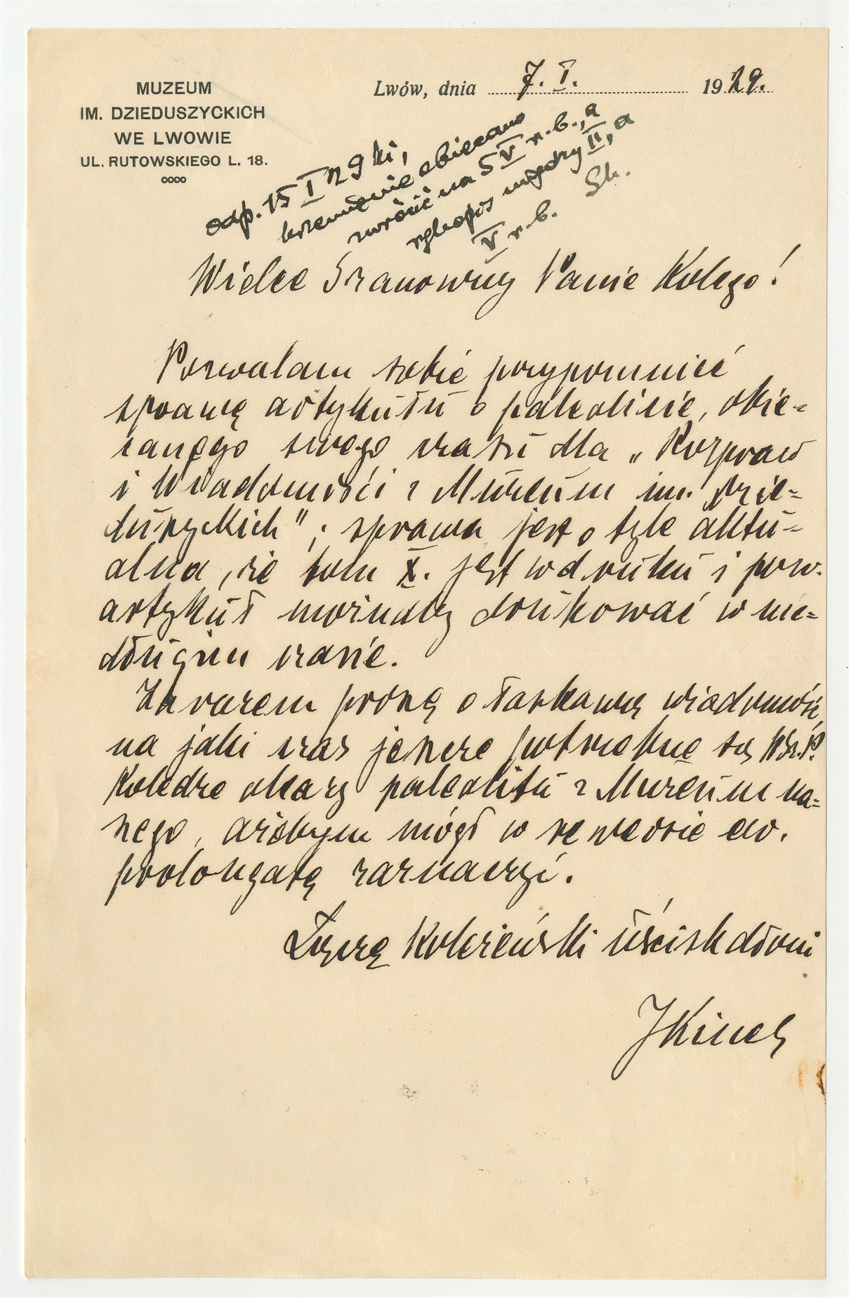 Rękopis - list NN (podpis nieczytelny) z Muzeum Dzieduszyckich we Lwowie do Stefana Krukowskiego z dnia 7 I 1929 roku